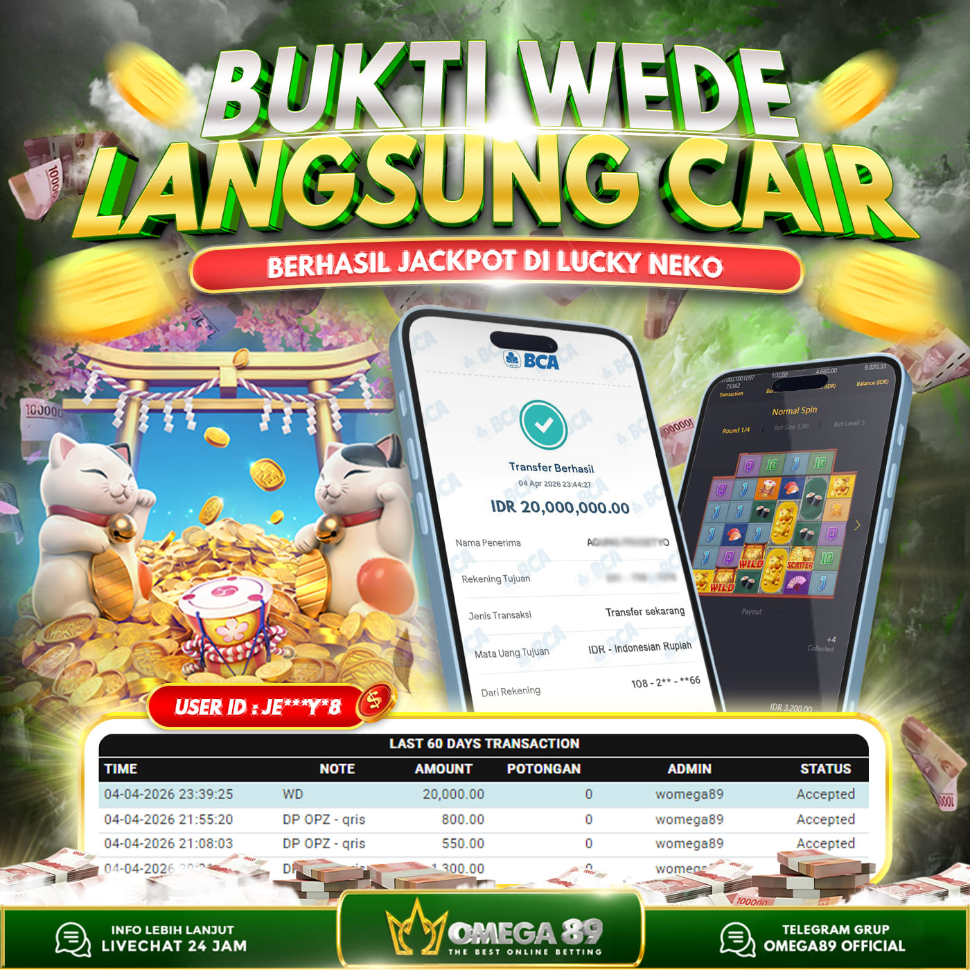 Selamat untuk Member OMEGA89 dengan User ID : JE***Y*8 Telah berhasil memenangkan jackpot besar dalam permainan slot LUCKY NEKO sebesar Rp.20.000.000, Lalu setelah melakukan pengisian formulir untuk melakukan withdraw dengan jeda waktu 3–5 menit pihak Customer Service Omega89 akan melakukan proses transfer ke rekening pribadi milik User ID tersebut dan dana yang sudah di withdraw bisa langsung di cairkan oleh pemenang jackpot. Bukti transfer atau pembayaran yang di berikan pihak Omega89 adalah bentuk bukti pemaabayaran yang VALID/SAH karena langsung dari bank tujuan yang digunakan.