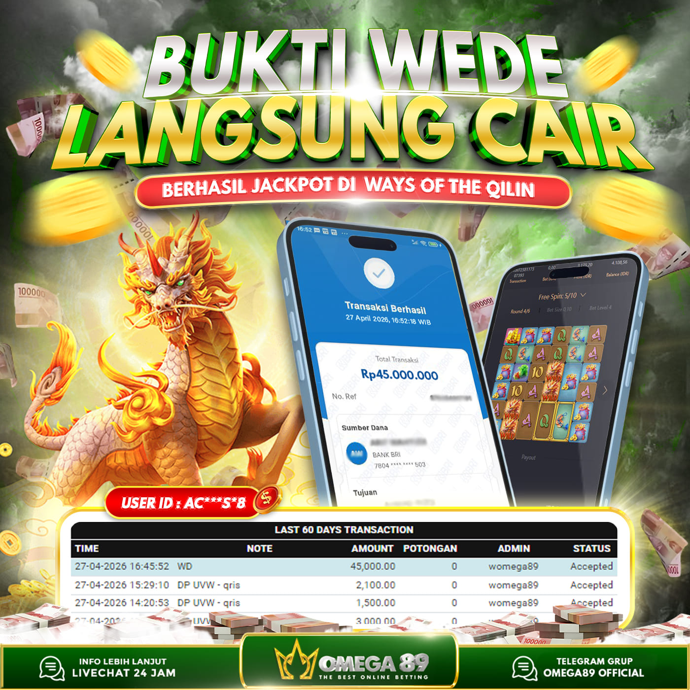 Selamat untuk Member OMEGA89 dengan User ID : AC***S*8 Telah berhasil memenangkan jackpot besar dalam permainan slot WAYS OF THE QILIN sebesar Rp.45.000.000, Lalu setelah melakukan pengisian formulir untuk melakukan withdraw dengan jeda waktu 3–5 menit pihak Customer Service Omega89 akan melakukan proses transfer ke rekening pribadi milik User ID tersebut dan dana yang sudah di withdraw bisa langsung di cairkan oleh pemenang jackpot. Bukti transfer atau pembayaran yang di berikan pihak Omega89 adalah bentuk bukti pemaabayaran yang VALID/SAH karena langsung dari bank tujuan yang digunakan.