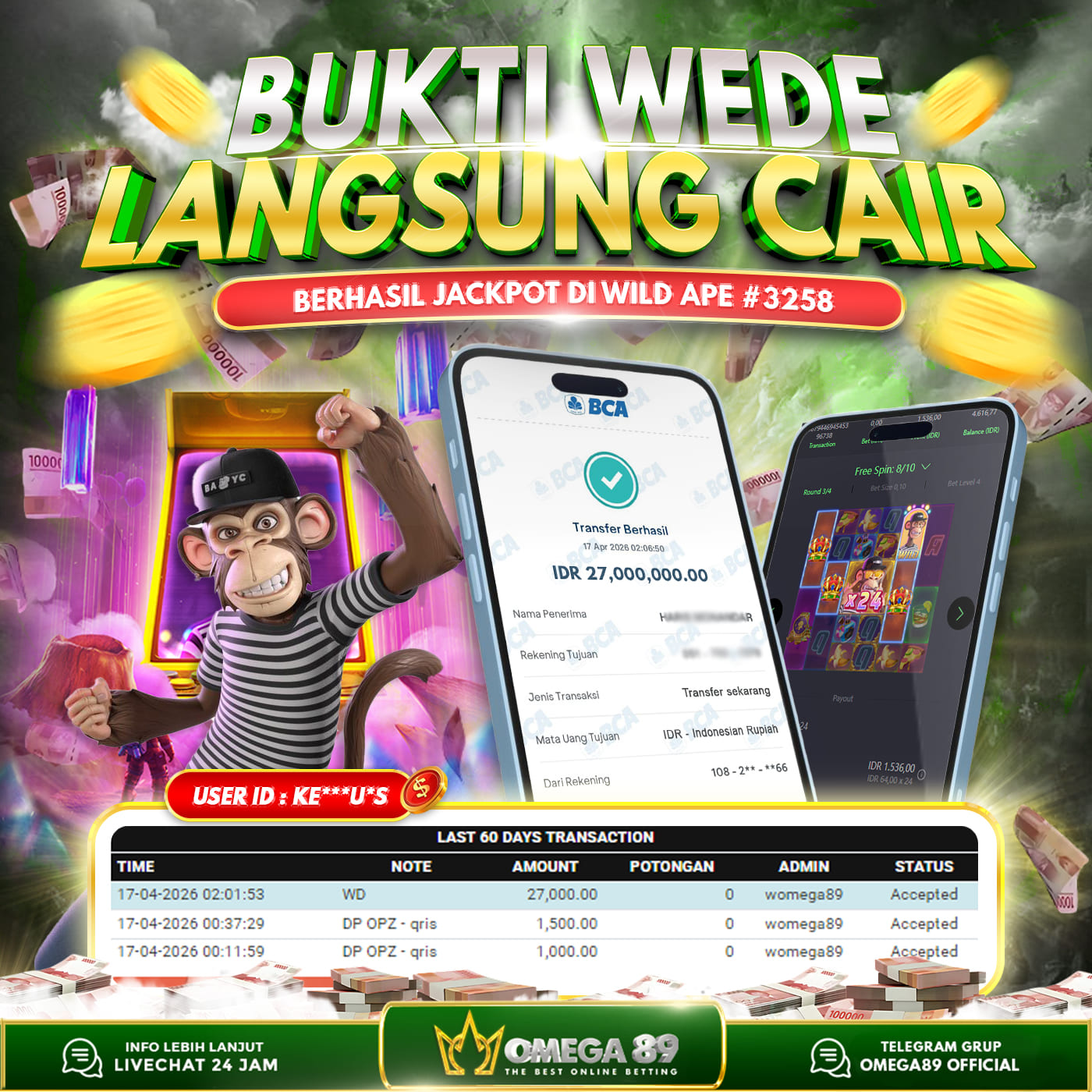 Selamat untuk Member OMEGA89 dengan User ID : KE***U*S Telah berhasil memenangkan jackpot besar dalam permainan slot WILD APE #3258 sebesar Rp.27.000.000, Lalu setelah melakukan pengisian formulir untuk melakukan withdraw dengan jeda waktu 3–5 menit pihak Customer Service Omega89 akan melakukan proses transfer ke rekening pribadi milik User ID tersebut dan dana yang sudah di withdraw bisa langsung di cairkan oleh pemenang jackpot. Bukti transfer atau pembayaran yang di berikan pihak Omega89 adalah bentuk bukti pemaabayaran yang VALID/SAH karena langsung dari bank tujuan yang digunakan.