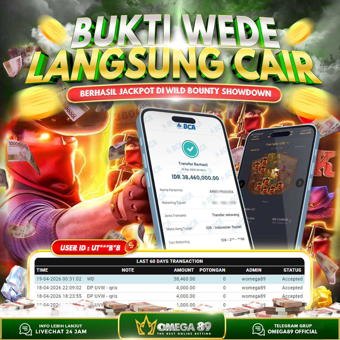 Selamat untuk Member OMEGA89 dengan User ID : UT***B*8 Telah berhasil memenangkan jackpot besar dalam permainan slot WILD BOUNTY SHOWDOWN sebesar Rp.38.460.000, Lalu setelah melakukan pengisian formulir untuk melakukan withdraw dengan jeda waktu 3–5 menit pihak Customer Service Omega89 akan melakukan proses transfer ke rekening pribadi milik User ID tersebut dan dana yang sudah di withdraw bisa langsung di cairkan oleh pemenang jackpot. Bukti transfer atau pembayaran yang di berikan pihak Omega89 adalah bentuk bukti pemaabayaran yang VALID/SAH karena langsung dari bank tujuan yang digunakan.