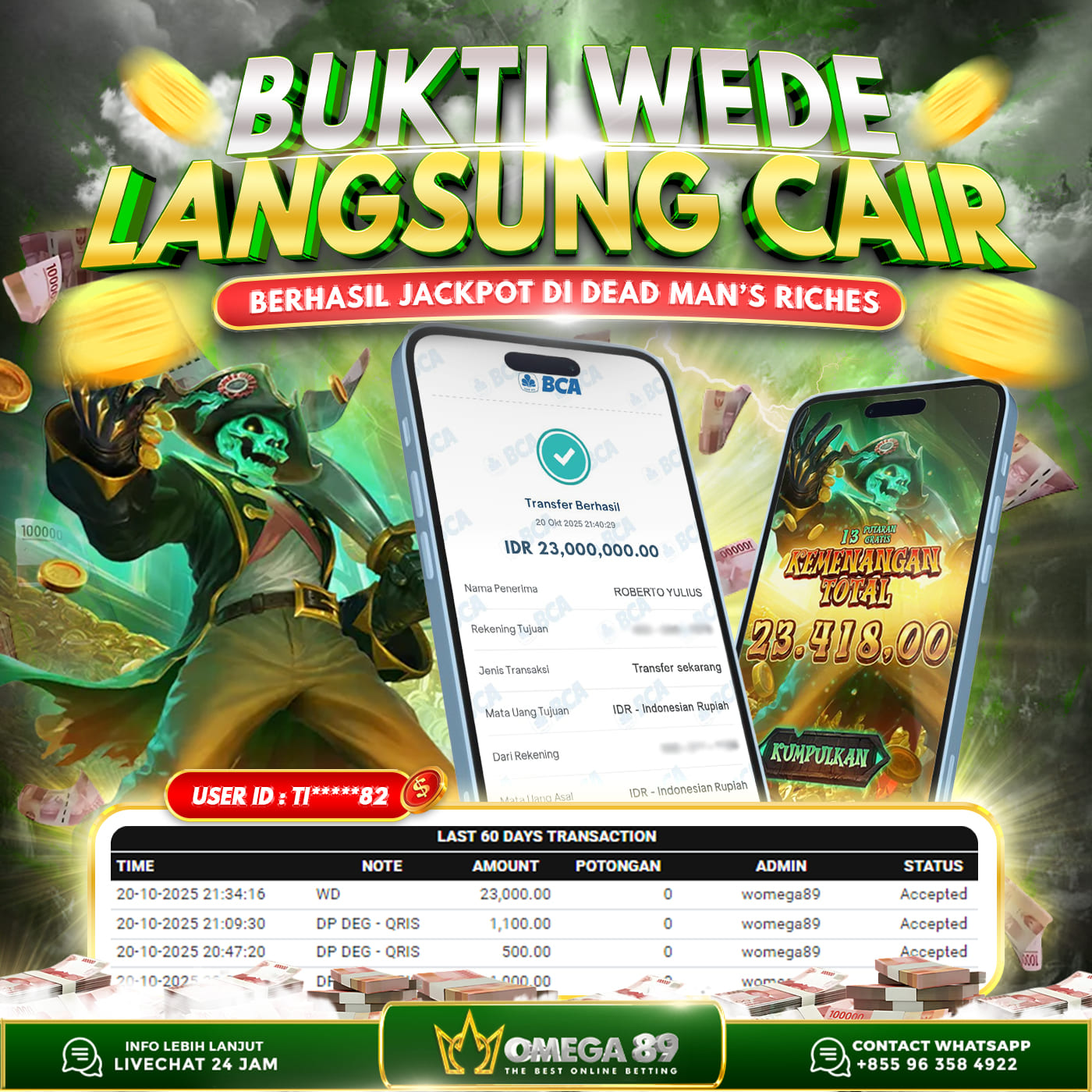 Selamat untuk Member OMEGA89 dengan User ID : TI*****82 Telah berhasil memenangkan jackpot besar dalam permainan slot DEAD MAN’S RICHES sebesar Rp.23.000.000, Lalu setelah melakukan pengisian formulir untuk melakukan withdraw dengan jeda waktu 3–5 menit pihak Customer Service Omega89 akan melakukan proses transfer ke rekening pribadi milik User ID tersebut dan dana yang sudah di withdraw bisa langsung di cairkan oleh pemenang jackpot. Bukti transfer atau pembayaran yang di berikan pihak Omega89 adalah bentuk bukti pembayaran yang VALID/SAH karena langsung dari bank tujuan yang digunakan.