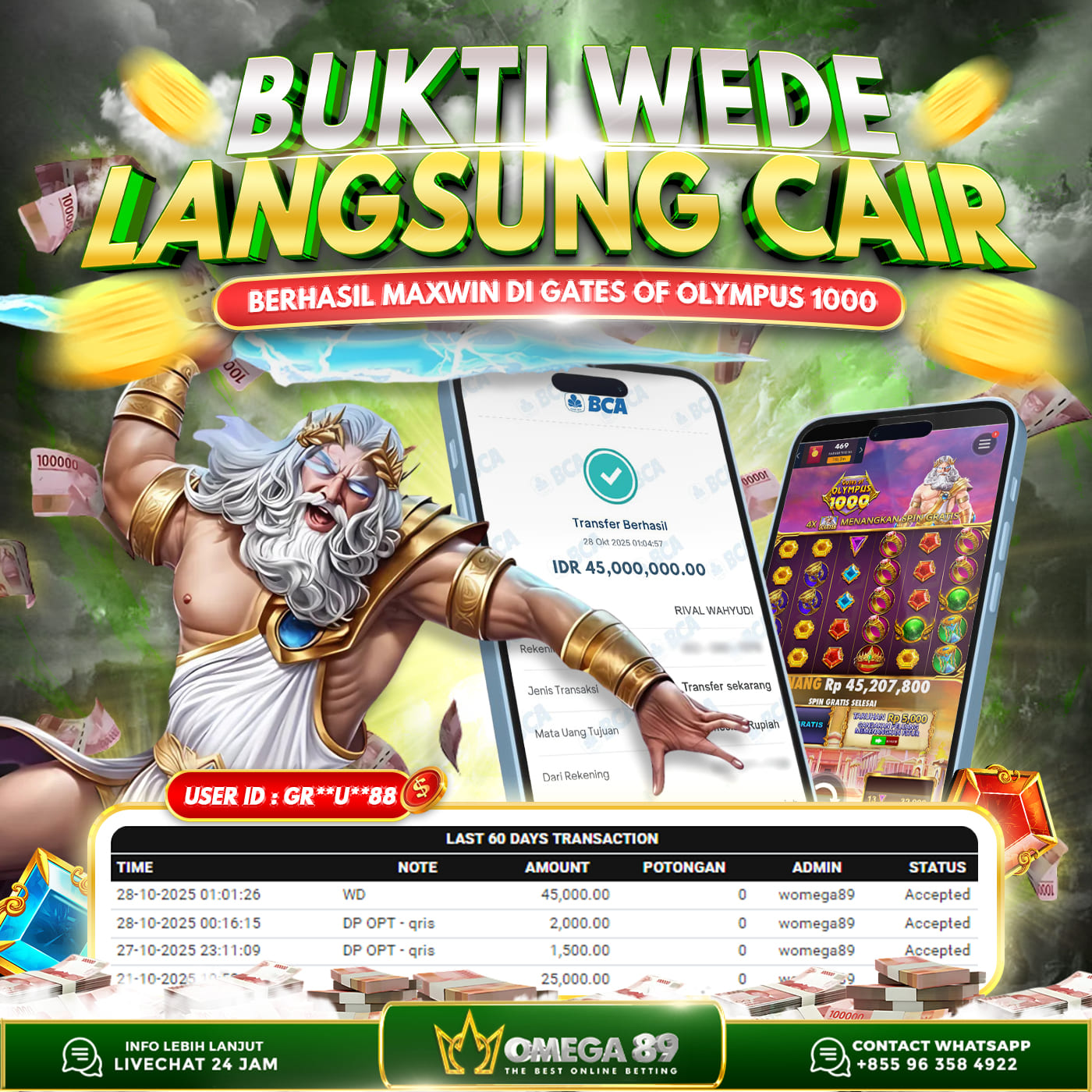Selamat untuk Member OMEGA89 dengan User ID : GR**U*88 Telah berhasil memenangkan jackpot besar dalam permainan slot GATES OF OLYMPUS 1000 sebesar Rp.45.000.000, Lalu setelah melakukan pengisian formulir untuk melakukan withdraw dengan jeda waktu 3–5 menit pihak Customer Service Omega89 akan melakukan proses transfer ke rekening pribadi milik User ID tersebut dan dana yang sudah di withdraw bisa langsung di cairkan oleh pemenang jackpot. Bukti transfer atau pembayaran yang di berikan pihak Omega89 adalah bentuk bukti pemaabayaran yang VALID/SAH karena langsung dari bank tujuan yang digunakan.