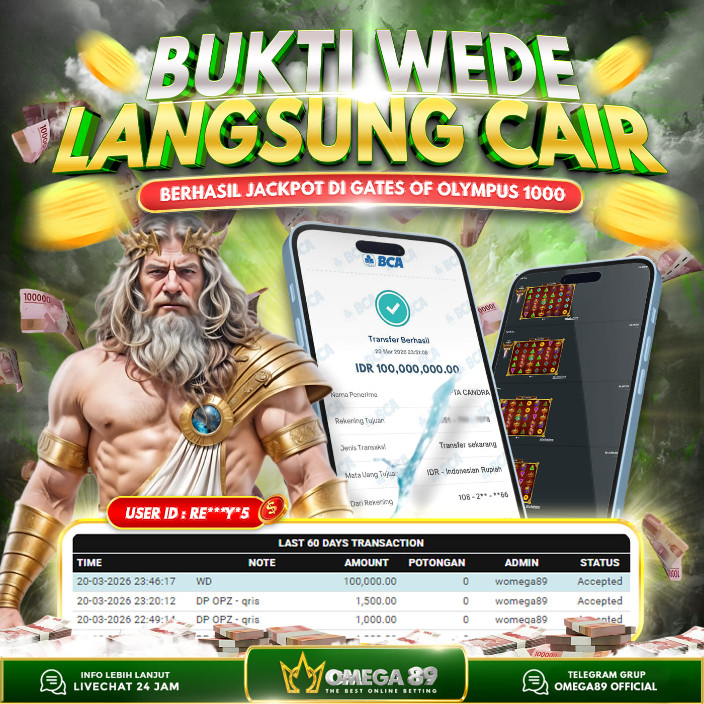 Selamat untuk Member OMEGA89 dengan User ID : RE***Y*5 Telah berhasil memenangkan jackpot besar dalam permainan slot GATES OF OLYMPUS 1000 sebesar Rp.100.000.000, Lalu setelah melakukan pengisian formulir untuk melakukan withdraw dengan jeda waktu 3–5 menit pihak Customer Service Omega89 akan melakukan proses transfer ke rekening pribadi milik User ID tersebut dan dana yang sudah di withdraw bisa langsung di cairkan oleh pemenang jackpot. Bukti transfer atau pembayaran yang di berikan pihak Omega89 adalah bentuk bukti pemaabayaran yang VALID/SAH karena langsung dari bank tujuan yang digunakan.