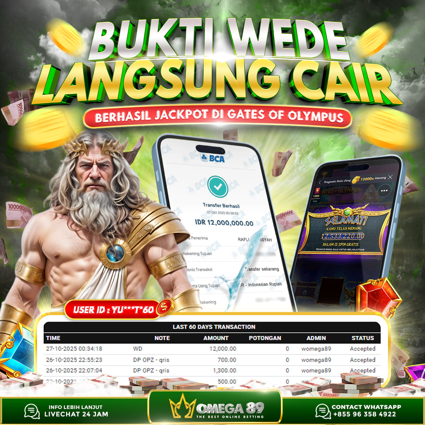 Selamat untuk Member OMEGA89 dengan User ID : YU***T*60 Telah berhasil memenangkan jackpot besar dalam permainan slot GATES OF OLYMPUS sebesar Rp.12.000.000, Lalu setelah melakukan pengisian formulir untuk melakukan withdraw dengan jeda waktu 3–5 menit pihak Customer Service Omega89 akan melakukan proses transfer ke rekening pribadi milik User ID tersebut dan dana yang sudah di withdraw bisa langsung di cairkan oleh pemenang jackpot. Bukti transfer atau pembayaran yang di berikan pihak Omega89 adalah bentuk bukti pemaabayaran yang VALID/SAH karena langsung dari bank tujuan yang digunakan.
