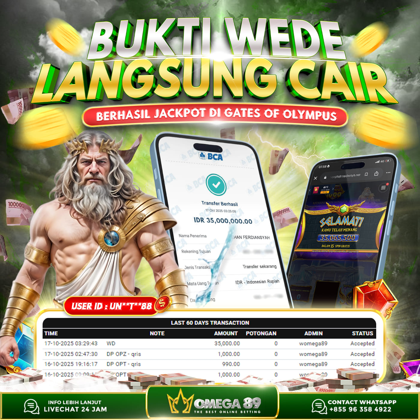 Selamat untuk Member OMEGA89 dengan User ID : UN**T**88 Telah berhasil memenangkan jackpot besar dalam permainan slot GATES OF OLYMPUS sebesar Rp.35.000.000, Lalu setelah melakukan pengisian formulir untuk melakukan withdraw dengan jeda waktu 3–5 menit pihak Customer Service Omega89 akan melakukan proses transfer ke rekening pribadi milik User ID tersebut dan dana yang sudah di withdraw bisa langsung di cairkan oleh pemenang jackpot. Bukti transfer atau pembayaran yang di berikan pihak Omega89 adalah bentuk bukti pembayaran yang VALID/SAH karena langsung dari bank tujuan yang digunakan.