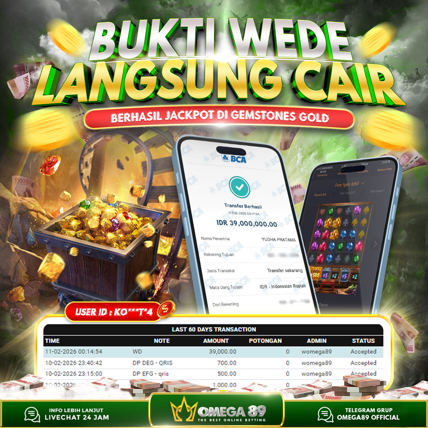 Selamat untuk Member OMEGA89 dengan User ID : KO***T*4 Telah berhasil memenangkan jackpot besar dalam permainan slot GEMSTONES GOLD sebesar Rp.39.000.000, Lalu setelah melakukan pengisian formulir untuk melakukan withdraw dengan jeda waktu 3–5 menit pihak Customer Service Omega89 akan melakukan proses transfer ke rekening pribadi milik User ID tersebut dan dana yang sudah di withdraw bisa langsung di cairkan oleh pemenang jackpot. Bukti transfer atau pembayaran yang di berikan pihak Omega89 adalah bentuk bukti pemaabayaran yang VALID/SAH karena langsung dari bank tujuan yang digunakan.