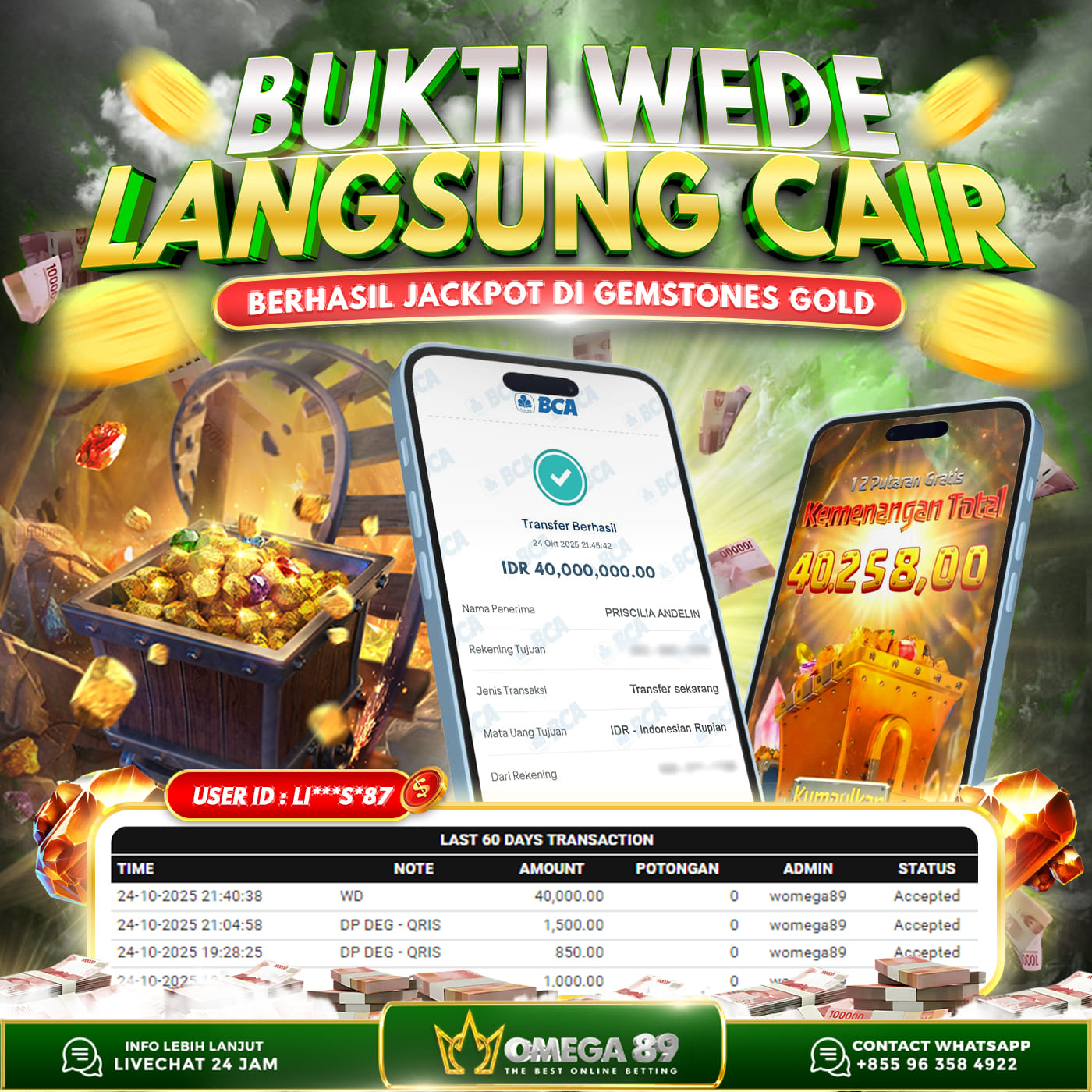 Selamat untuk Member OMEGA89 dengan User ID : LI***S*87 Telah berhasil memenangkan jackpot besar dalam permainan slot GEMSTONES GOLD sebesar Rp.40.000.000, Lalu setelah melakukan pengisian formulir untuk melakukan withdraw dengan jeda waktu 3–5 menit pihak Customer Service Omega89 akan melakukan proses transfer ke rekening pribadi milik User ID tersebut dan dana yang sudah di withdraw bisa langsung di cairkan oleh pemenang jackpot. Bukti transfer atau pembayaran yang di berikan pihak Omega89 adalah bentuk bukti pembayaran yang VALID/SAH karena langsung dari bank tujuan yang digunakan.
