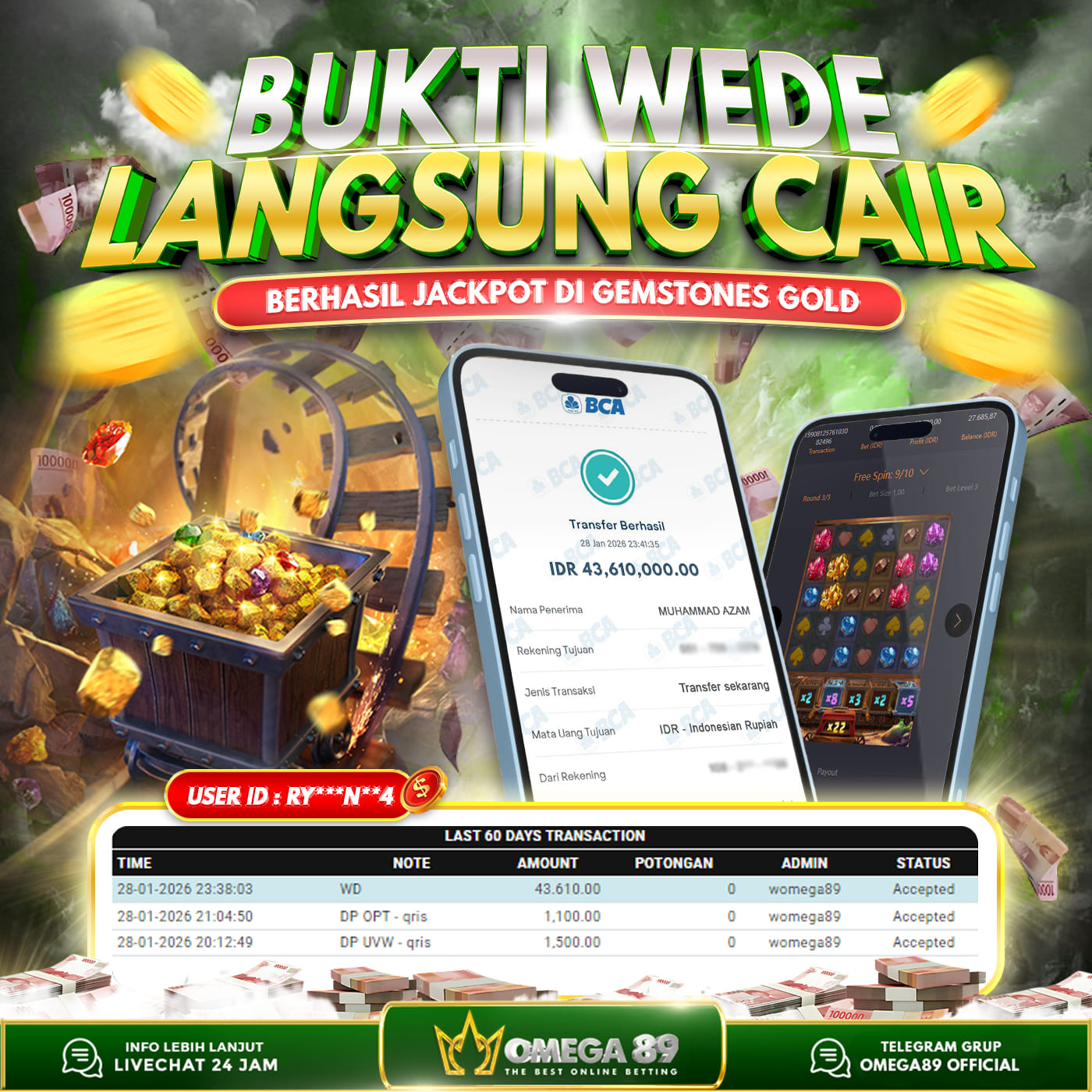 Selamat untuk Member OMEGA89 dengan User ID : RY***N*4 Telah berhasil memenangkan jackpot besar dalam permainan slot GEMSTONES GOLD sebesar Rp.43.610.000, Lalu setelah melakukan pengisian formulir untuk melakukan withdraw dengan jeda waktu 3–5 menit pihak Customer Service Omega89 akan melakukan proses transfer ke rekening pribadi milik User ID tersebut dan dana yang sudah di withdraw bisa langsung di cairkan oleh pemenang jackpot. Bukti transfer atau pembayaran yang di berikan pihak Omega89 adalah bentuk bukti pemaabayaran yang VALID/SAH karena langsung dari bank tujuan yang digunakan.