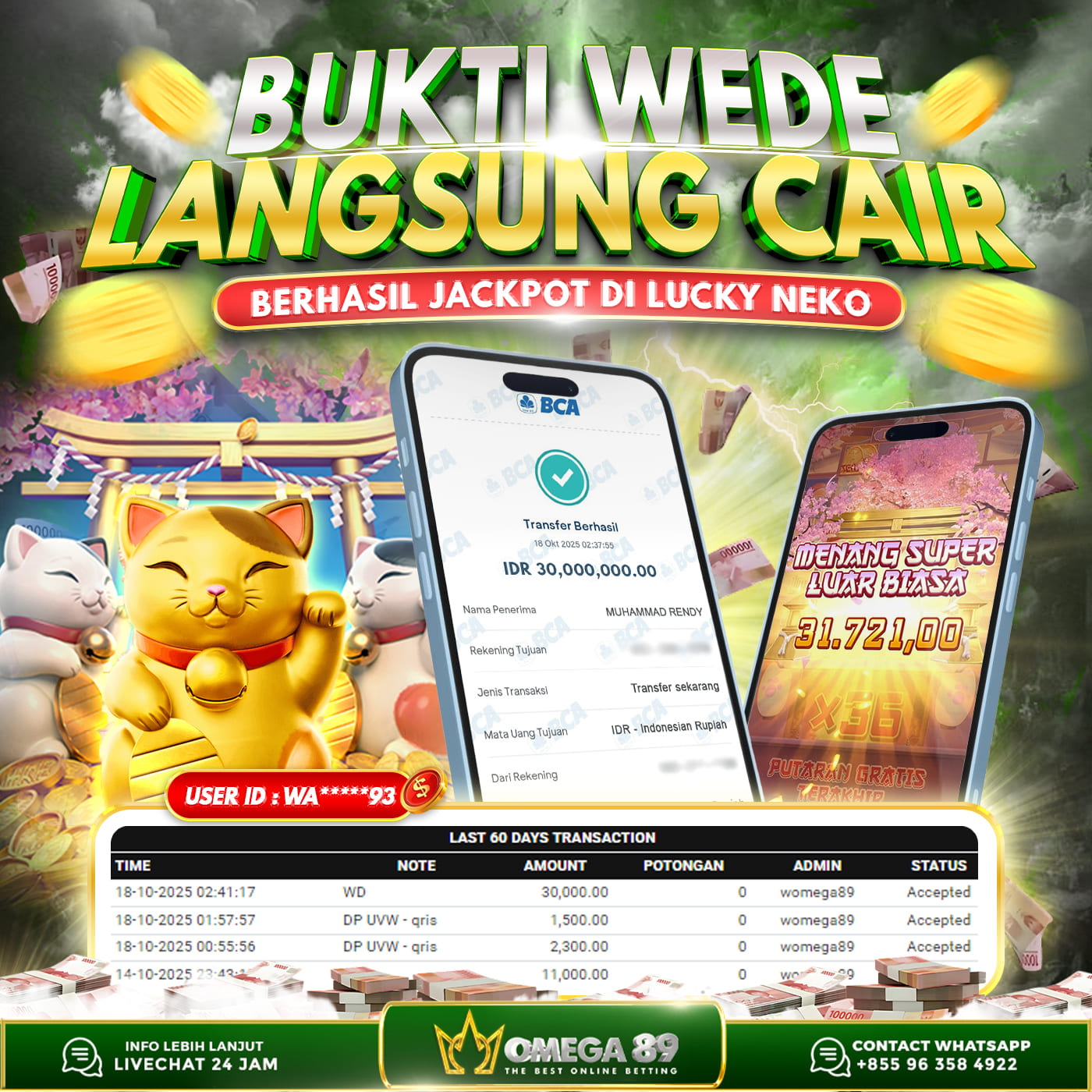 Selamat untuk Member OMEGA89 dengan User ID : WA*****93 Telah berhasil memenangkan jackpot besar dalam permainan slot LUCKY NEKO sebesar Rp.30.000.000, Lalu setelah melakukan pengisian formulir untuk melakukan withdraw dengan jeda waktu 3–5 menit pihak Customer Service Omega89 akan melakukan proses transfer ke rekening pribadi milik User ID tersebut dan dana yang sudah di withdraw bisa langsung di cairkan oleh pemenang jackpot. Bukti transfer atau pembayaran yang di berikan pihak Omega89 adalah bentuk bukti pembayaran yang VALID/SAH karena langsung dari bank tujuan yang digunakan.