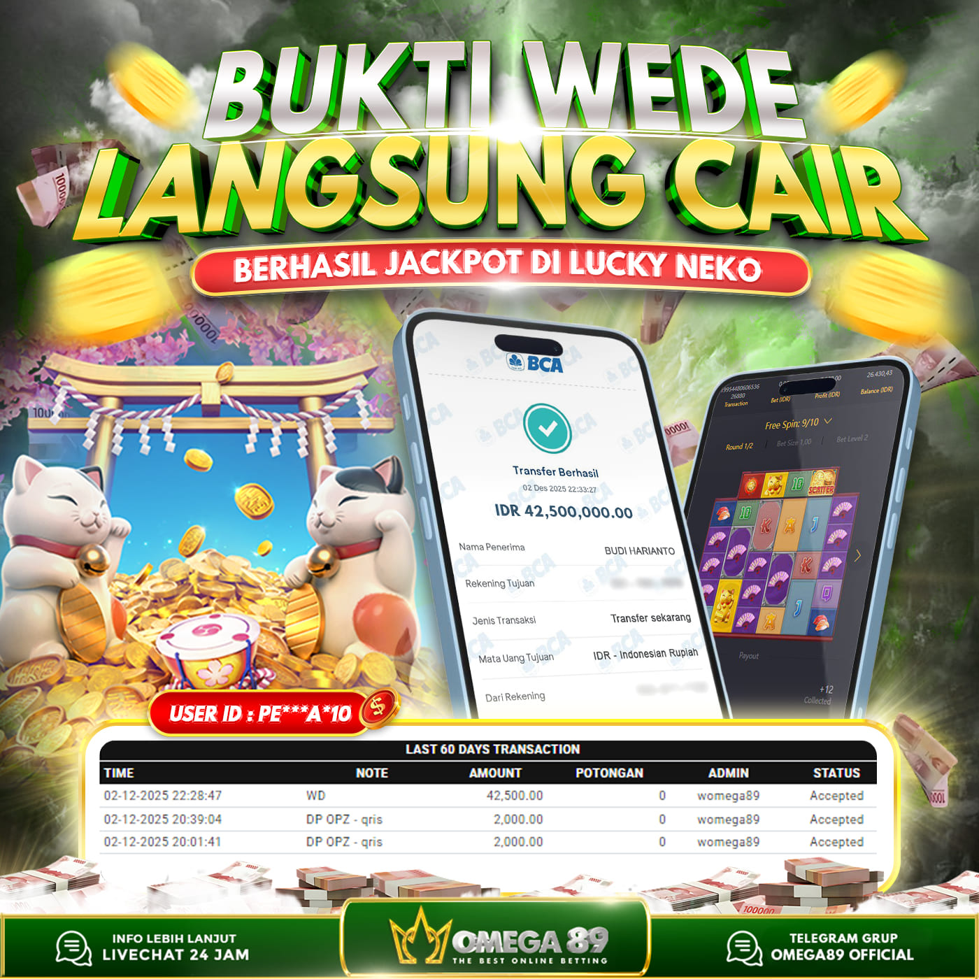 Selamat untuk Member OMEGA89 dengan User ID : PE***A*10 Telah berhasil memenangkan jackpot besar dalam permainan slot LUCKY NEKO sebesar Rp.42.500.000, Lalu setelah melakukan pengisian formulir untuk melakukan withdraw dengan jeda waktu 3–5 menit pihak Customer Service Omega89 akan melakukan proses transfer ke rekening pribadi milik User ID tersebut dan dana yang sudah di withdraw bisa langsung di cairkan oleh pemenang jackpot. Bukti transfer atau pembayaran yang di berikan pihak Omega89 adalah bentuk bukti pemaabayaran yang VALID/SAH karena langsung dari bank tujuan yang digunakan.