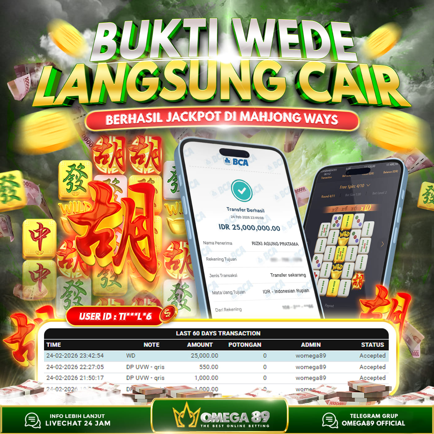 Selamat untuk Member OMEGA89 dengan User ID : TI***L*6 Telah berhasil memenangkan jackpot besar dalam permainan slot MAHJONG WAYS sebesar Rp.25.000.000, Lalu setelah melakukan pengisian formulir untuk melakukan withdraw dengan jeda waktu 3–5 menit pihak Customer Service Omega89 akan melakukan proses transfer ke rekening pribadi milik User ID tersebut dan dana yang sudah di withdraw bisa langsung di cairkan oleh pemenang jackpot. Bukti transfer atau pembayaran yang di berikan pihak Omega89 adalah bentuk bukti pemaabayaran yang VALID/SAH karena langsung dari bank tujuan yang digunakan.
