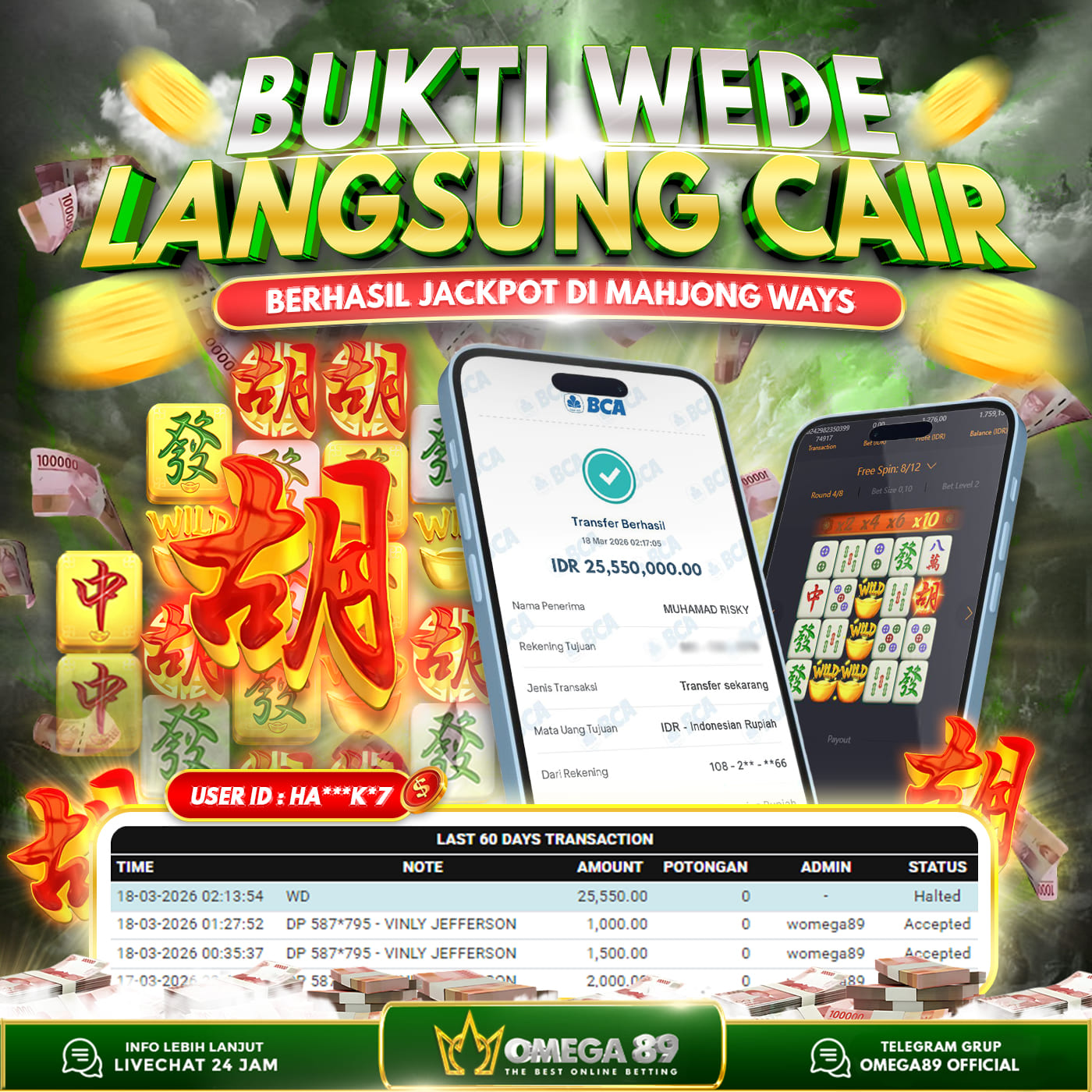 Selamat untuk Member OMEGA89 dengan User ID : HA***K*7 Telah berhasil memenangkan jackpot besar dalam permainan slot MAHJONG WAYS sebesar Rp.25.550.000, Lalu setelah melakukan pengisian formulir untuk melakukan withdraw dengan jeda waktu 3–5 menit pihak Customer Service Omega89 akan melakukan proses transfer ke rekening pribadi milik User ID tersebut dan dana yang sudah di withdraw bisa langsung di cairkan oleh pemenang jackpot. Bukti transfer atau pembayaran yang di berikan pihak Omega89 adalah bentuk bukti pemaabayaran yang VALID/SAH karena langsung dari bank tujuan yang digunakan.