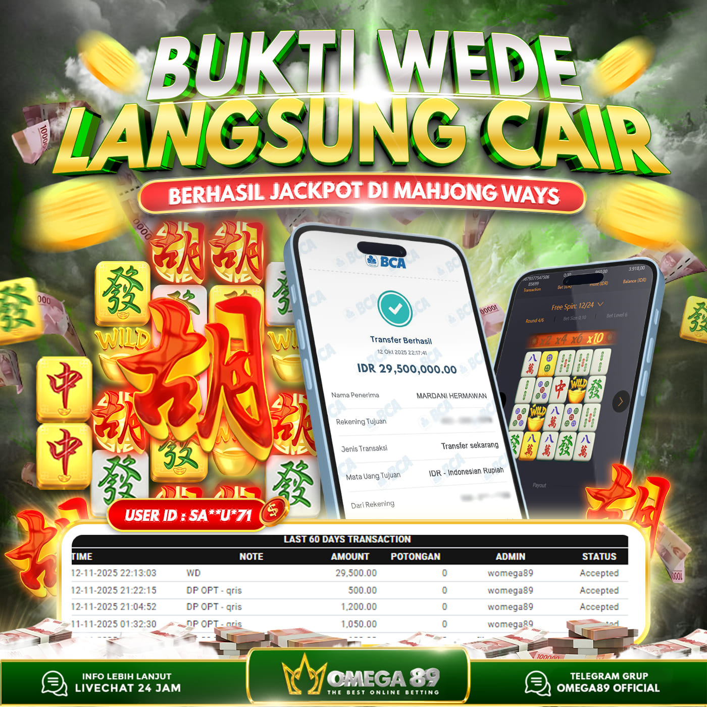 Selamat untuk Member OMEGA89 dengan User ID : SA**U*71 Telah berhasil memenangkan jackpot besar dalam permainan slot MAHJONG WAYS sebesar Rp.29.500.000, Lalu setelah melakukan pengisian formulir untuk melakukan withdraw dengan jeda waktu 3–5 menit pihak Customer Service Omega89 akan melakukan proses transfer ke rekening pribadi milik User ID tersebut dan dana yang sudah di withdraw bisa langsung di cairkan oleh pemenang jackpot. Bukti transfer atau pembayaran yang di berikan pihak Omega89 adalah bentuk bukti pemaabayaran yang VALID/SAH karena langsung dari bank tujuan yang digunakan.