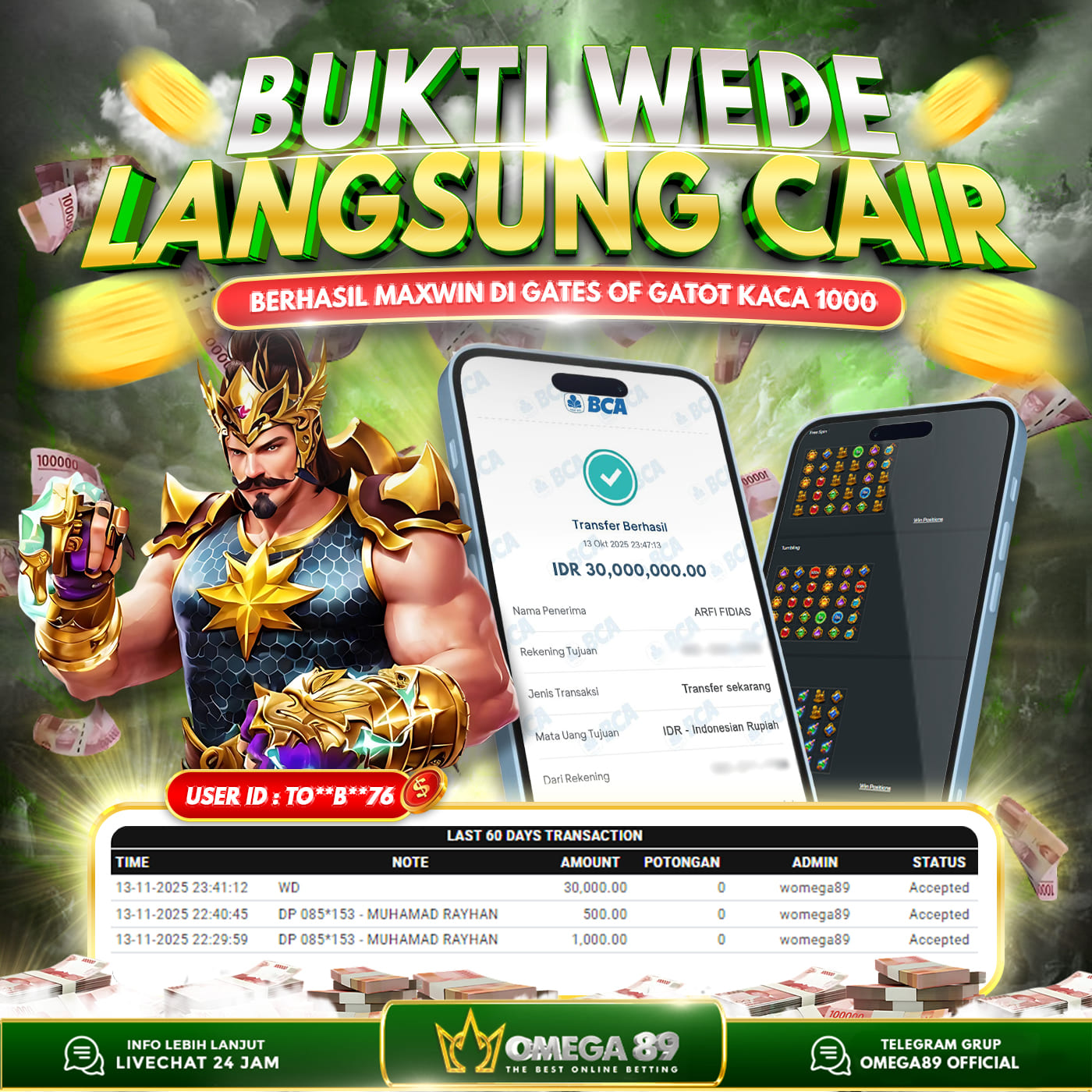 Selamat untuk Member OMEGA89 dengan User ID : TO**B*76 Telah berhasil memenangkan jackpot besar dalam permainan slot GATES OF GATOTKACA sebesar Rp.30.000.000, Lalu setelah melakukan pengisian formulir untuk melakukan withdraw dengan jeda waktu 3–5 menit pihak Customer Service Omega89 akan melakukan proses transfer ke rekening pribadi milik User ID tersebut dan dana yang sudah di withdraw bisa langsung di cairkan oleh pemenang jackpot. Bukti transfer atau pembayaran yang di berikan pihak Omega89 adalah bentuk bukti pemaabayaran yang VALID/SAH karena langsung dari bank tujuan yang digunakan.
