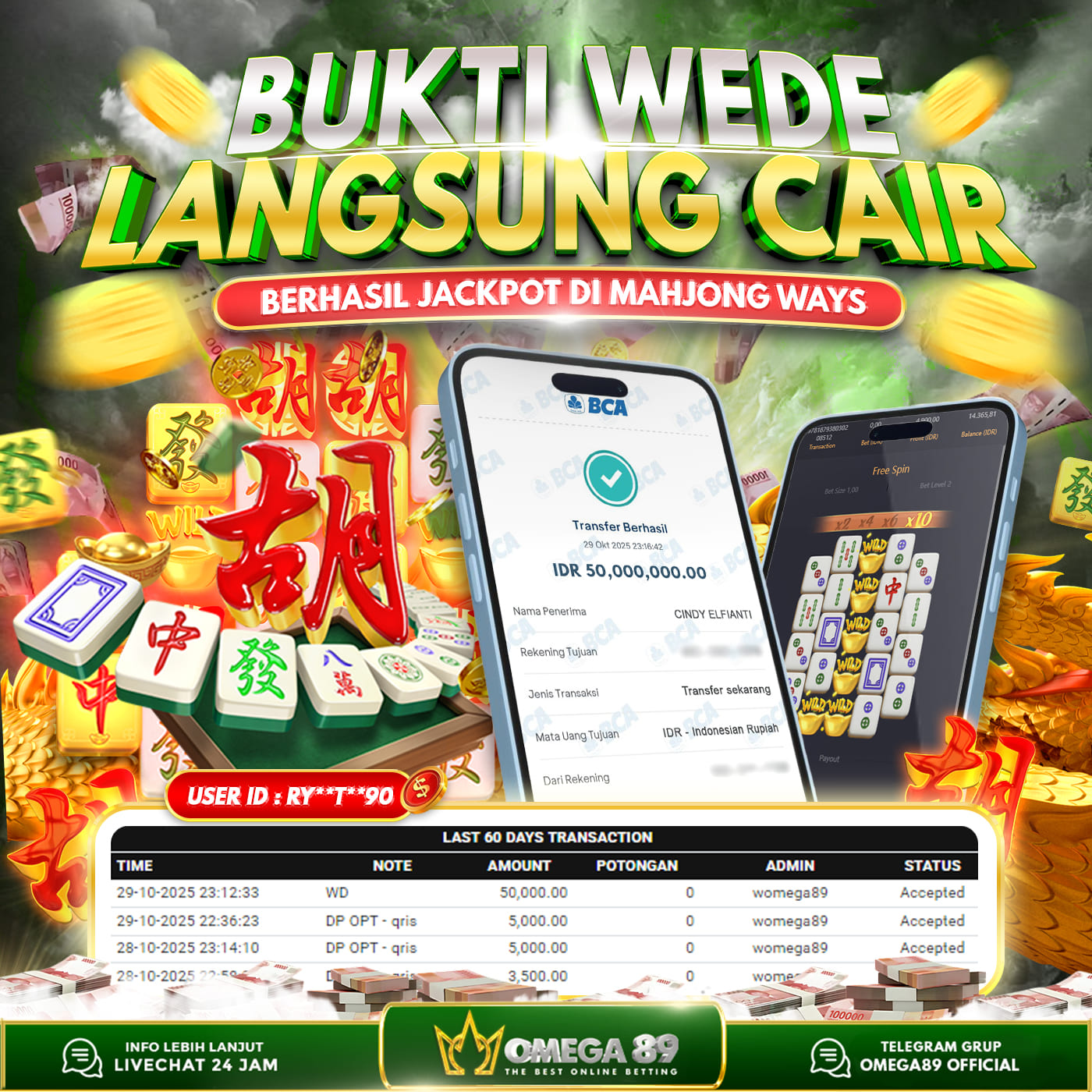 Selamat untuk Member OMEGA89 dengan User ID : RY**T*90 Telah berhasil memenangkan jackpot besar dalam permainan slot MAHJONG WAYS sebesar Rp.50.000.000, Lalu setelah melakukan pengisian formulir untuk melakukan withdraw dengan jeda waktu 3–5 menit pihak Customer Service Omega89 akan melakukan proses transfer ke rekening pribadi milik User ID tersebut dan dana yang sudah di withdraw bisa langsung di cairkan oleh pemenang jackpot. Bukti transfer atau pembayaran yang di berikan pihak Omega89 adalah bentuk bukti pemaabayaran yang VALID/SAH karena langsung dari bank tujuan yang digunakan.