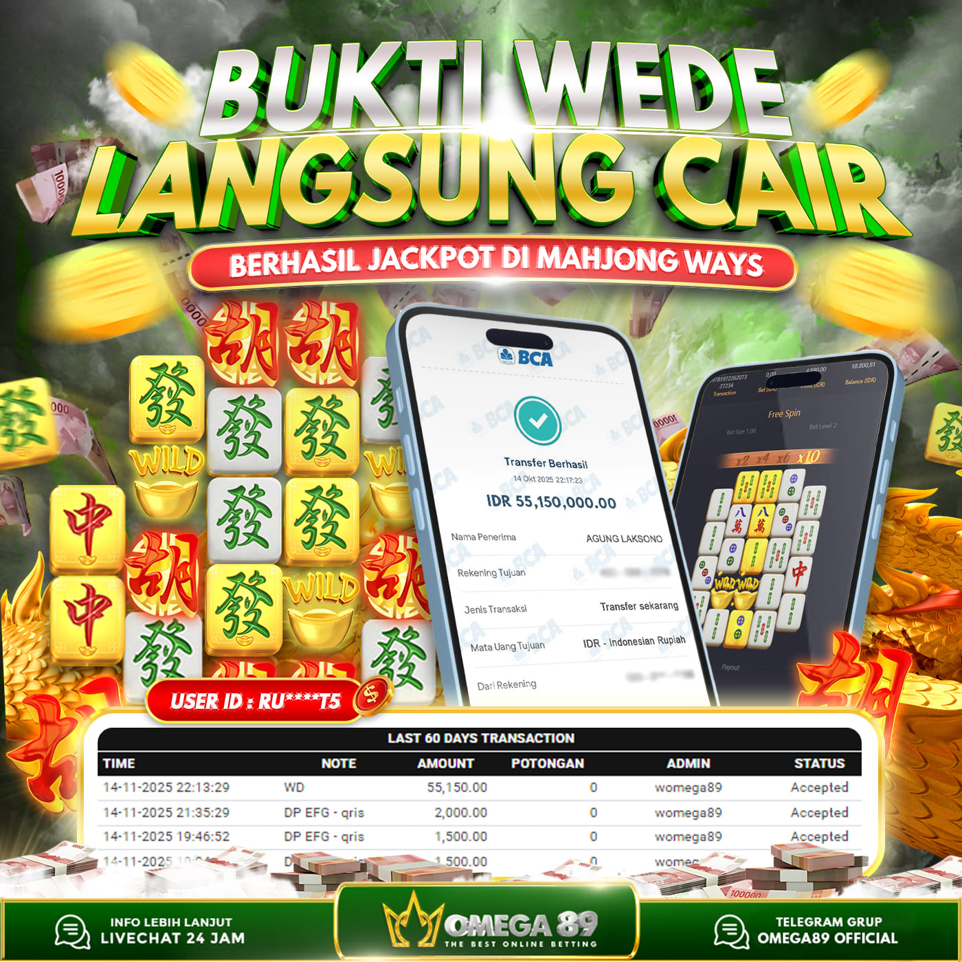 Selamat untuk Member OMEGA89 dengan User ID : RU*****T5 Telah berhasil memenangkan jackpot besar dalam permainan slot MAHJONG WAYS sebesar Rp.55.150.000, Lalu setelah melakukan pengisian formulir untuk melakukan withdraw dengan jeda waktu 3–5 menit pihak Customer Service Omega89 akan melakukan proses transfer ke rekening pribadi milik User ID tersebut dan dana yang sudah di withdraw bisa langsung di cairkan oleh pemenang jackpot. Bukti transfer atau pembayaran yang di berikan pihak Omega89 adalah bentuk bukti pemaabayaran yang VALID/SAH karena langsung dari bank tujuan yang digunakan.