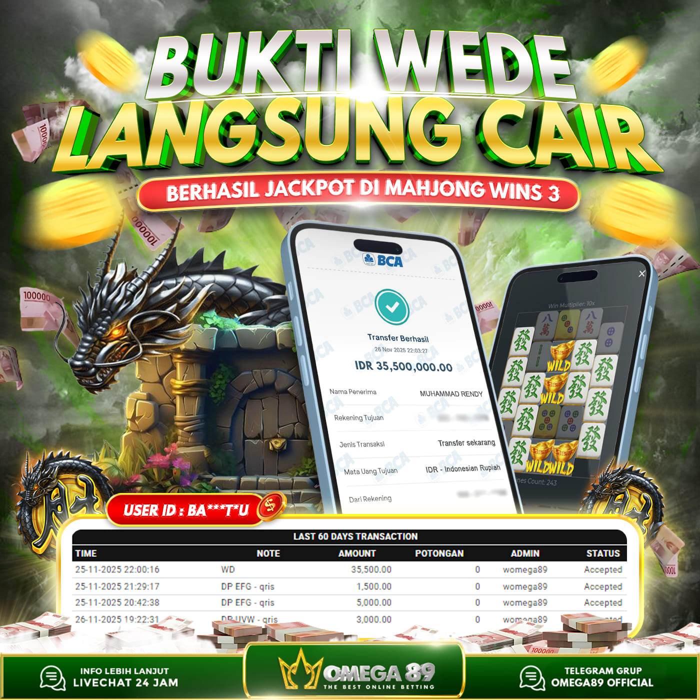 Selamat untuk Member OMEGA89 dengan User ID : BA***T*U Telah berhasil memenangkan jackpot besar dalam permainan slot MAHJONG WINS 3 sebesar Rp.35.500.000, Lalu setelah melakukan pengisian formulir untuk melakukan withdraw dengan jeda waktu 3–5 menit pihak Customer Service Omega89 akan melakukan proses transfer ke rekening pribadi milik User ID tersebut dan dana yang sudah di withdraw bisa langsung di cairkan oleh pemenang jackpot. Bukti transfer atau pembayaran yang di berikan pihak Omega89 adalah bentuk bukti pemaabayaran yang VALID/SAH karena langsung dari bank tujuan yang digunakan.