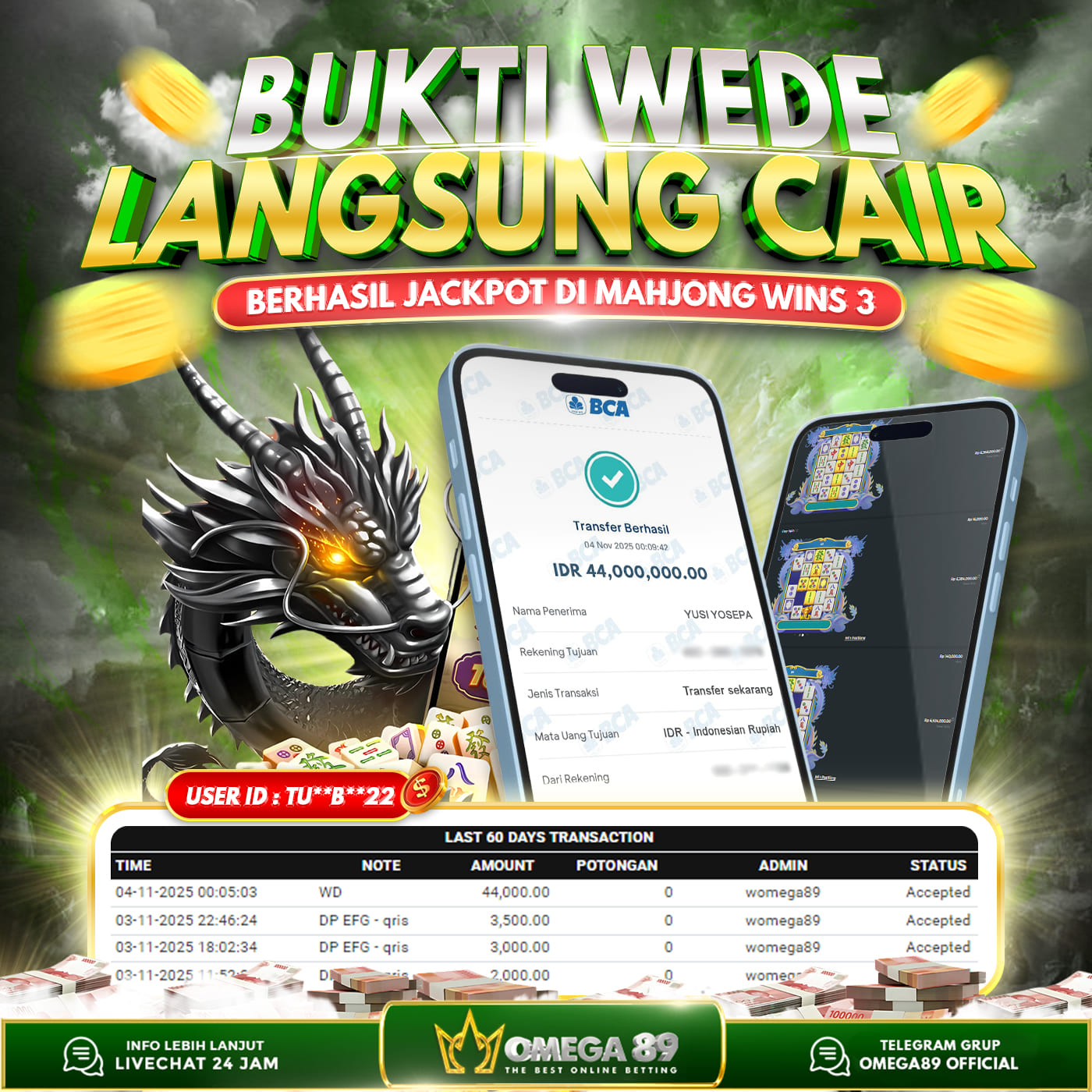 Selamat untuk Member OMEGA89 dengan User ID : TU**B**22 Telah berhasil memenangkan jackpot besar dalam permainan slot MAHJONG WINS 3 sebesar Rp.44.000.000, Lalu setelah melakukan pengisian formulir untuk melakukan withdraw dengan jeda waktu 3–5 menit pihak Customer Service Omega89 akan melakukan proses transfer ke rekening pribadi milik User ID tersebut dan dana yang sudah di withdraw bisa langsung di cairkan oleh pemenang jackpot. Bukti transfer atau pembayaran yang di berikan pihak Omega89 adalah bentuk bukti pemaabayaran yang VALID/SAH karena langsung dari bank tujuan yang digunakan.
