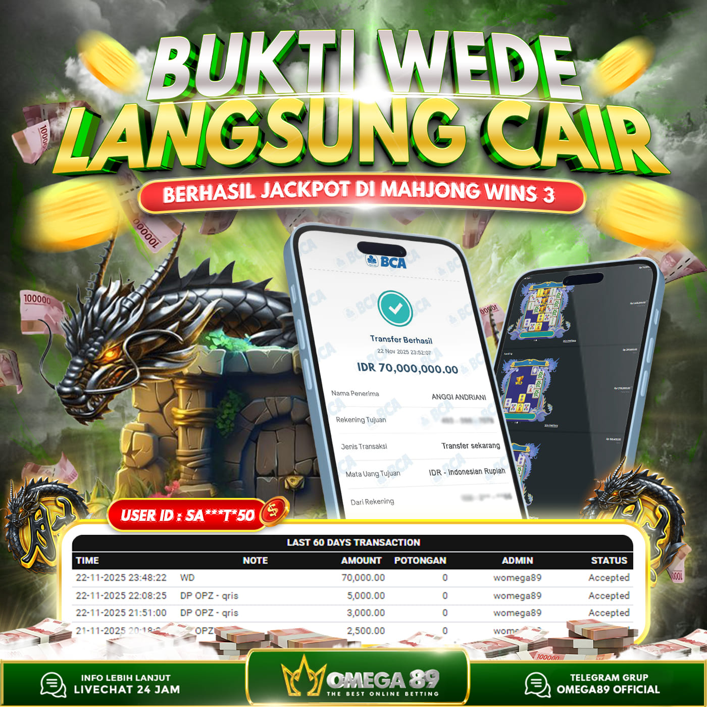 Selamat untuk Member OMEGA89 dengan User ID : ZU***U*77 Telah berhasil memenangkan jackpot besar dalam permainan slot MAHJONG WINS 3 sebesar Rp.70.000.000, Lalu setelah melakukan pengisian formulir untuk melakukan withdraw dengan jeda waktu 3–5 menit pihak Customer Service Omega89 akan melakukan proses transfer ke rekening pribadi milik User ID tersebut dan dana yang sudah di withdraw bisa langsung di cairkan oleh pemenang jackpot. Bukti transfer atau pembayaran yang di berikan pihak Omega89 adalah bentuk bukti pemaabayaran yang VALID/SAH karena langsung dari bank tujuan yang digunakan.