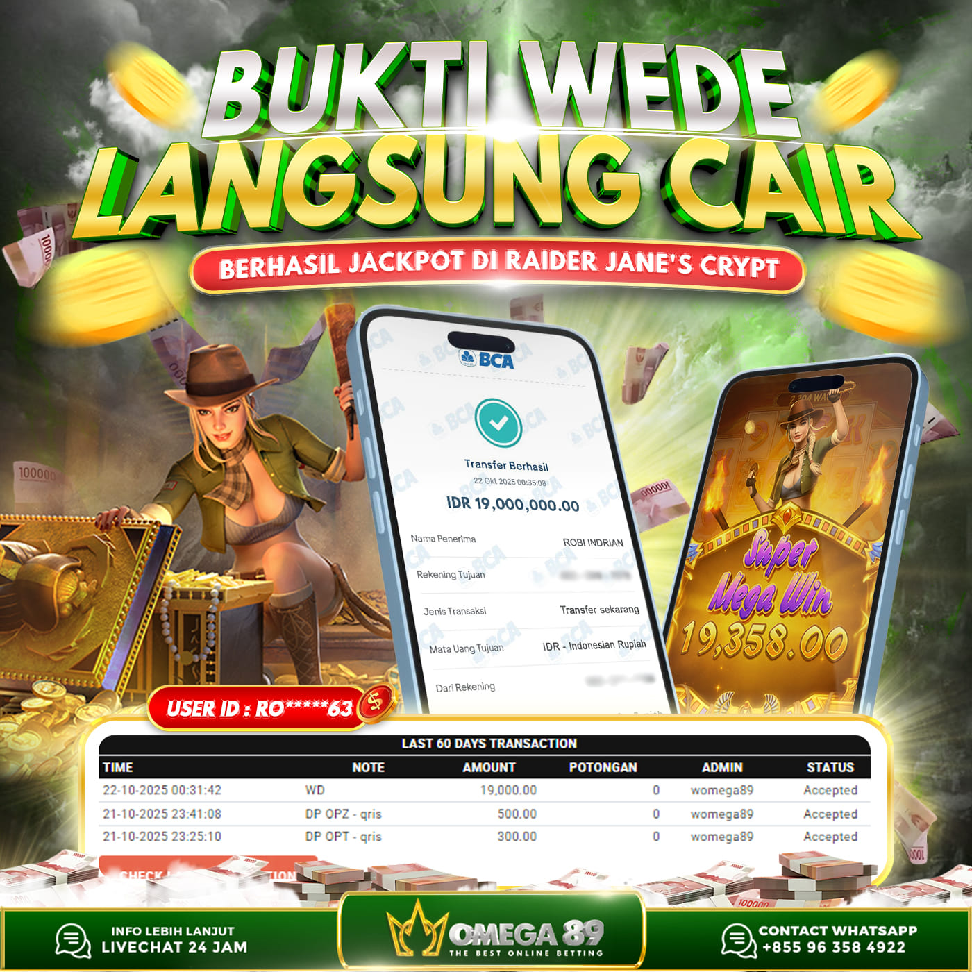 Selamat untuk Member OMEGA89 dengan User ID : RO*****63 Telah berhasil memenangkan jackpot besar dalam permainan slot RAIDER JANE’S CRYPT OF FORTUNE sebesar Rp.19.000.000, Lalu setelah melakukan pengisian formulir untuk melakukan withdraw dengan jeda waktu 3–5 menit pihak Customer Service Omega89 akan melakukan proses transfer ke rekening pribadi milik User ID tersebut dan dana yang sudah di withdraw bisa langsung di cairkan oleh pemenang jackpot. Bukti transfer atau pembayaran yang di berikan pihak Omega89 adalah bentuk bukti pembayaran yang VALID/SAH karena langsung dari bank tujuan yang digunakan.