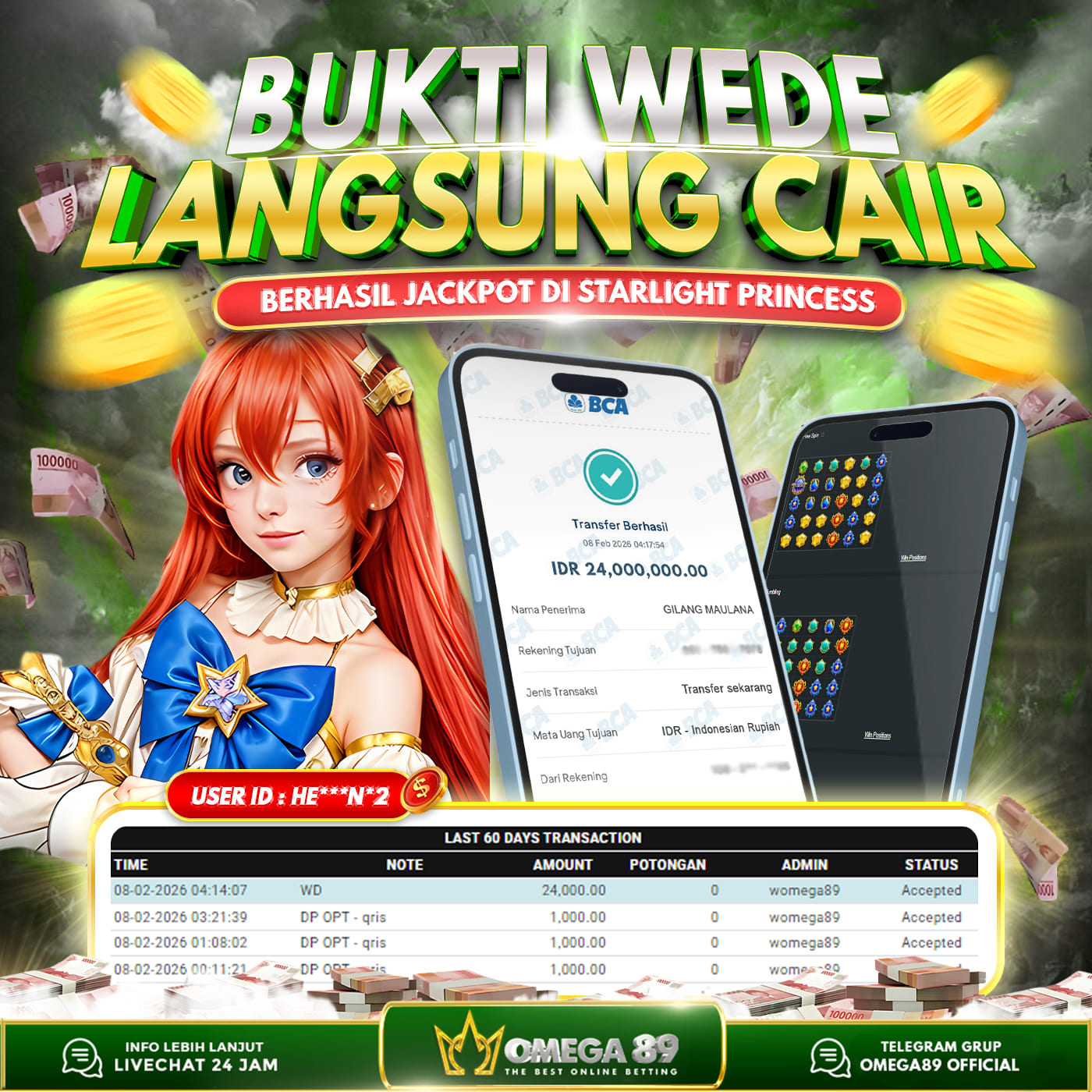 Selamat untuk Member OMEGA89 dengan User ID : HE***N*2 Telah berhasil memenangkan jackpot besar dalam permainan slot STARLIGHT PRINCESS sebesar Rp.24.000.000, Lalu setelah melakukan pengisian formulir untuk melakukan withdraw dengan jeda waktu 3–5 menit pihak Customer Service Omega89 akan melakukan proses transfer ke rekening pribadi milik User ID tersebut dan dana yang sudah di withdraw bisa langsung di cairkan oleh pemenang jackpot. Bukti transfer atau pembayaran yang di berikan pihak Omega89 adalah bentuk bukti pemaabayaran yang VALID/SAH karena langsung dari bank tujuan yang digunakan.