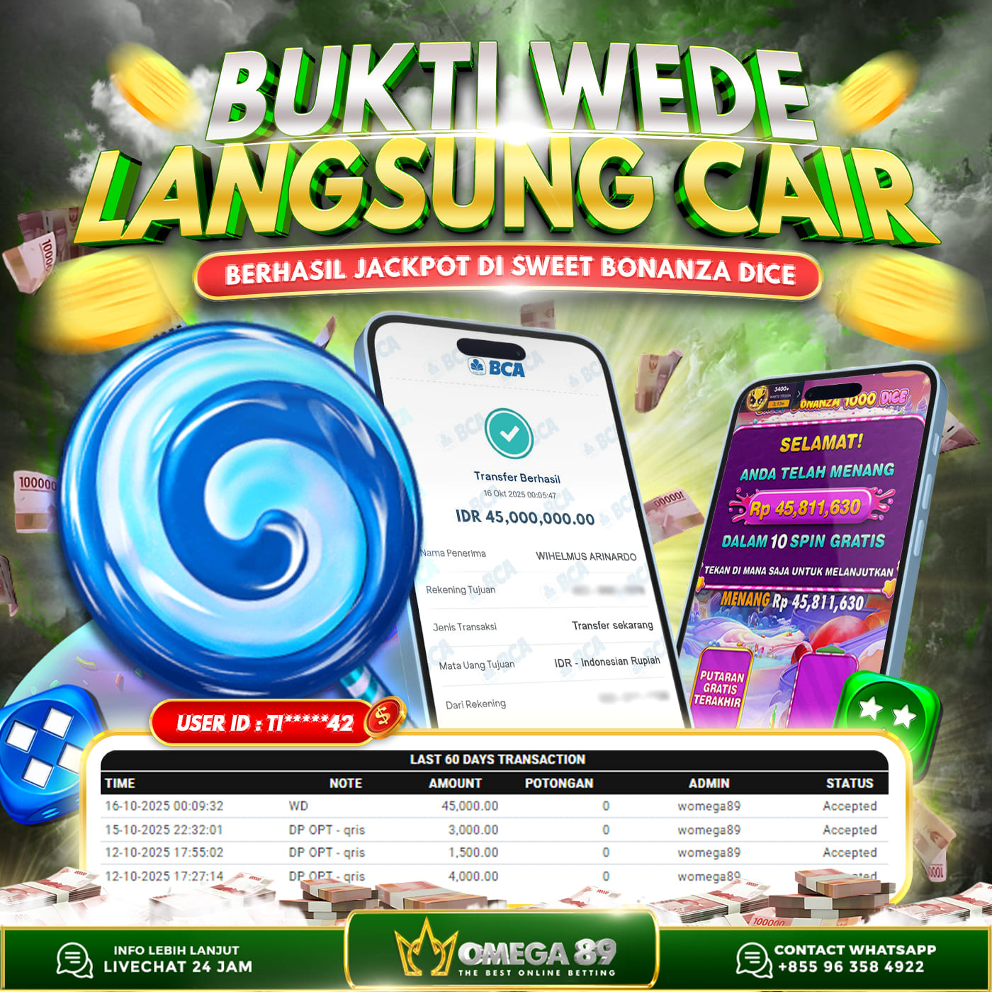 Selamat untuk Member OMEGA89 dengan User ID : TI*****42 Telah berhasil memenangkan jackpot besar dalam permainan slot SWEET BONANZA 1000 DICE sebesar Rp.45.000.000, Lalu setelah melakukan pengisian formulir untuk melakukan withdraw dengan jeda waktu 3–5 menit pihak Customer Service Omega89 akan melakukan proses transfer ke rekening pribadi milik User ID tersebut dan dana yang sudah di withdraw bisa langsung di cairkan oleh pemenang jackpot. Bukti transfer atau pembayaran yang di berikan pihak Omega89 adalah bentuk bukti pembayaran yang VALID/SAH karena langsung dari bank tujuan yang digunakan.