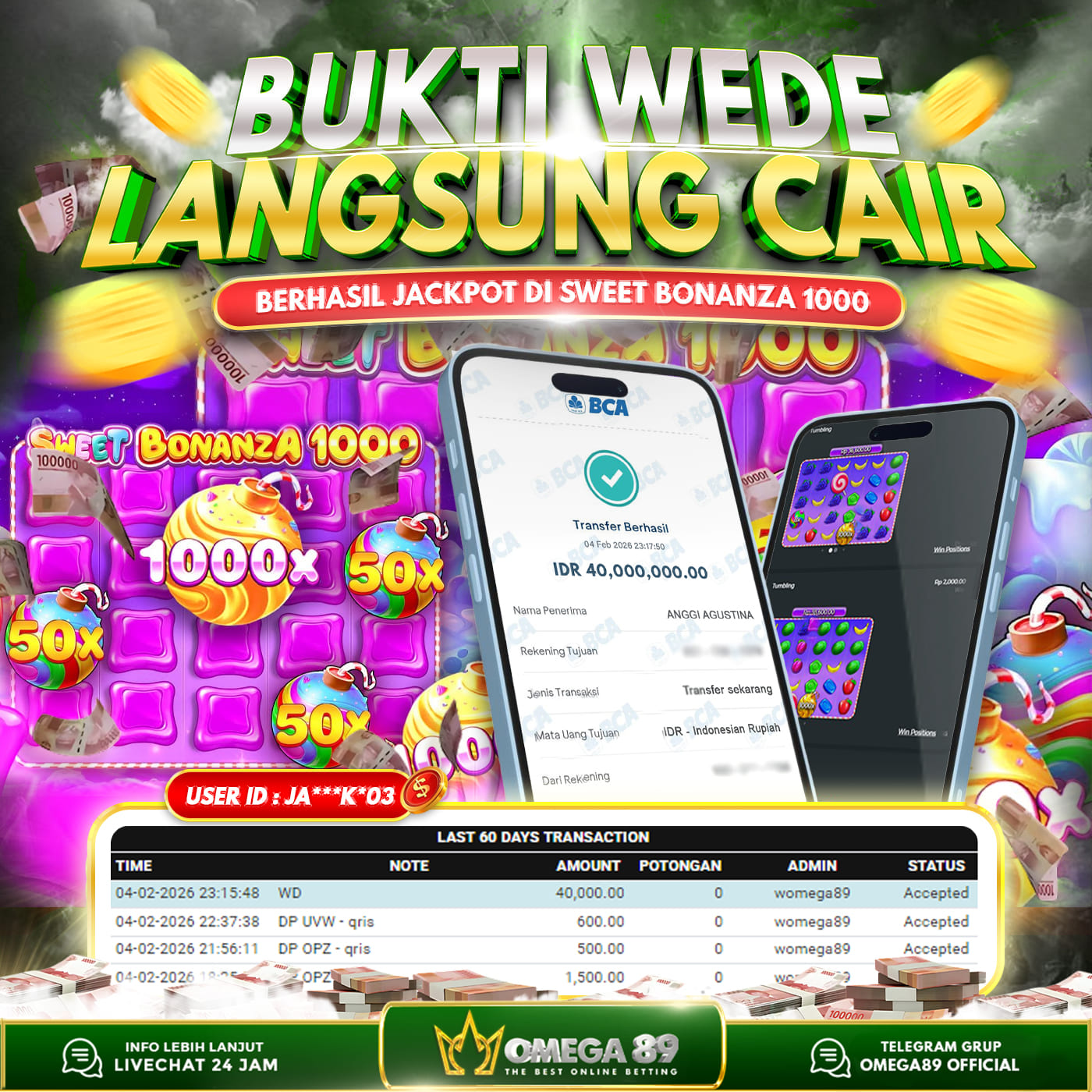Selamat untuk Member OMEGA89 dengan User ID : JA***K*03 Telah berhasil memenangkan jackpot besar dalam permainan slot SWEET BONANZA 1000 sebesar Rp.40.000.000, Lalu setelah melakukan pengisian formulir untuk melakukan withdraw dengan jeda waktu 3–5 menit pihak Customer Service Omega89 akan melakukan proses transfer ke rekening pribadi milik User ID tersebut dan dana yang sudah di withdraw bisa langsung di cairkan oleh pemenang jackpot. Bukti transfer atau pembayaran yang di berikan pihak Omega89 adalah bentuk bukti pemaabayaran yang VALID/SAH karena langsung dari bank tujuan yang digunakan.