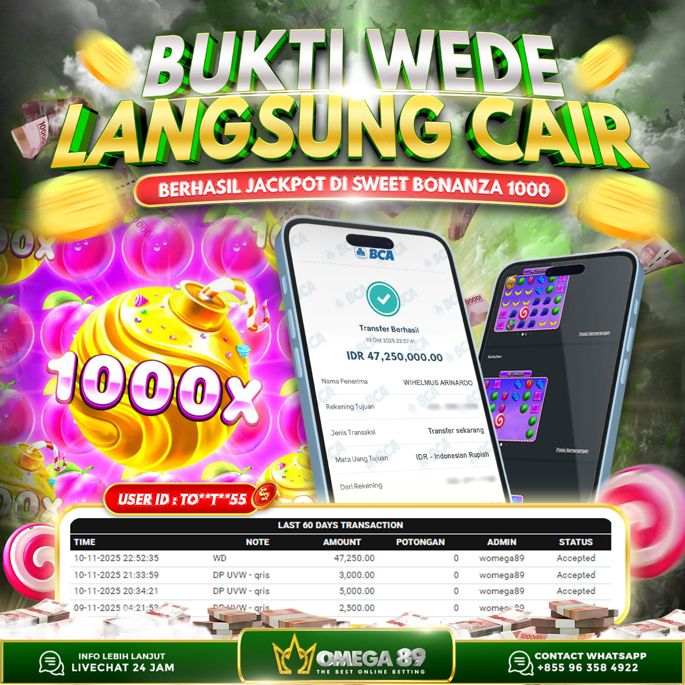 Selamat untuk Member OMEGA89 dengan User ID : TO**T**55 Telah berhasil memenangkan jackpot besar dalam permainan slot SWEET BONANZA 1000 sebesar Rp.47.250.000, Lalu setelah melakukan pengisian formulir untuk melakukan withdraw dengan jeda waktu 3–5 menit pihak Customer Service Omega89 akan melakukan proses transfer ke rekening pribadi milik User ID tersebut dan dana yang sudah di withdraw bisa langsung di cairkan oleh pemenang jackpot. Bukti transfer atau pembayaran yang di berikan pihak Omega89 adalah bentuk bukti pemaabayaran yang VALID/SAH karena langsung dari bank tujuan yang digunakan.