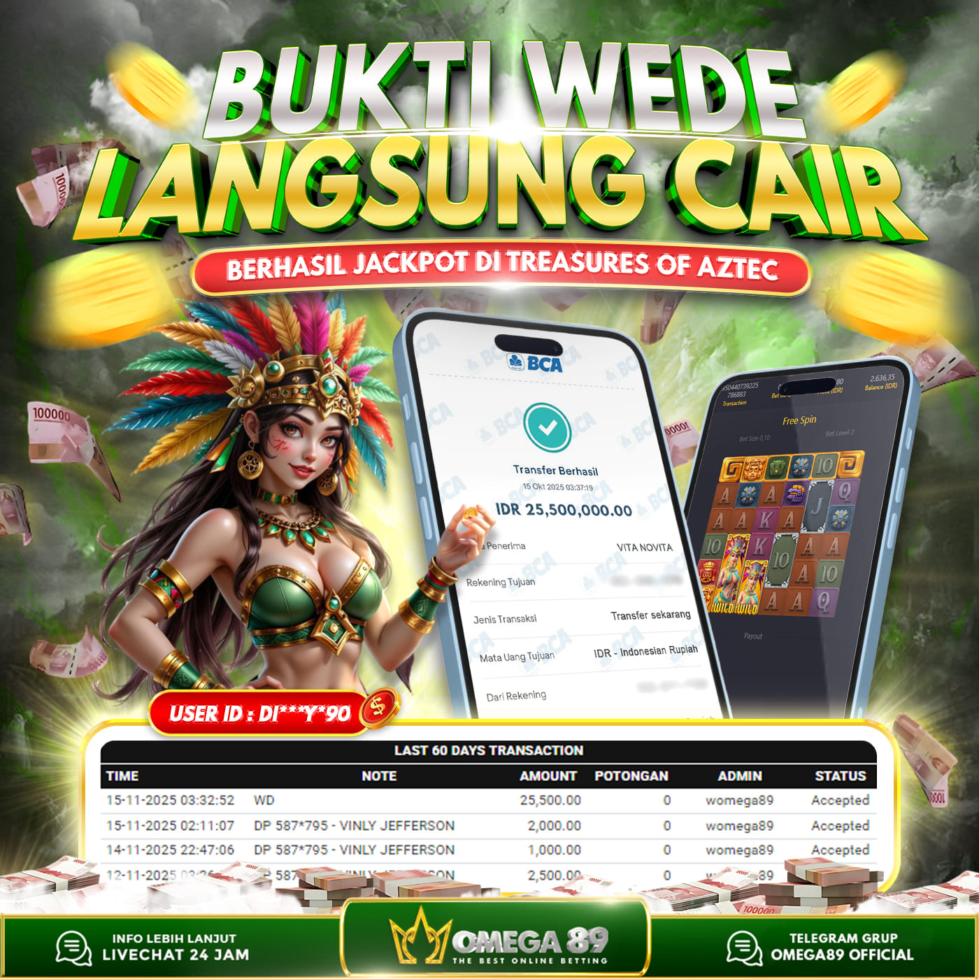 Selamat untuk Member OMEGA89 dengan User ID : DI***Y*90 Telah berhasil memenangkan jackpot besar dalam permainan slot TREASURES OF AZTEC sebesar Rp.25.500.000, Lalu setelah melakukan pengisian formulir untuk melakukan withdraw dengan jeda waktu 3–5 menit pihak Customer Service Omega89 akan melakukan proses transfer ke rekening pribadi milik User ID tersebut dan dana yang sudah di withdraw bisa langsung di cairkan oleh pemenang jackpot. Bukti transfer atau pembayaran yang di berikan pihak Omega89 adalah bentuk bukti pemaabayaran yang VALID/SAH karena langsung dari bank tujuan yang digunakan.