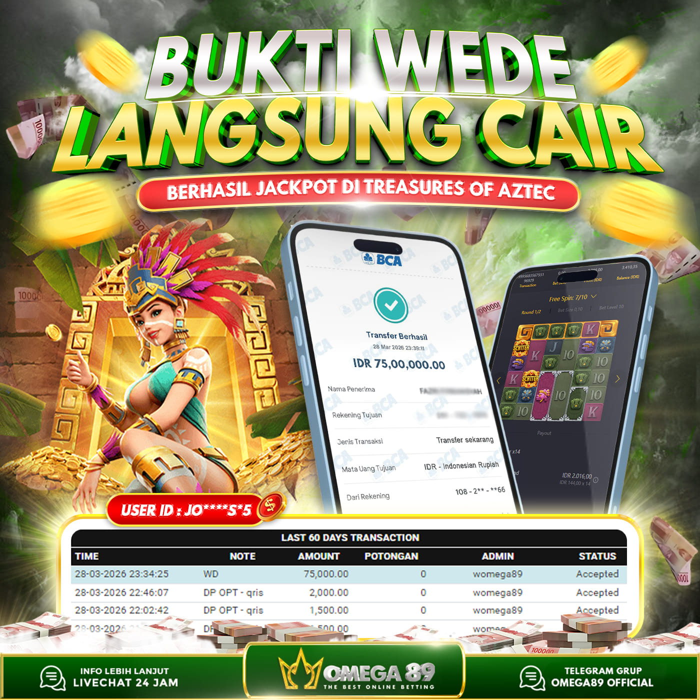 Selamat untuk Member OMEGA89 dengan User ID : JO****S*5 Telah berhasil memenangkan jackpot besar dalam permainan slot TREASURES OF AZTEC sebesar Rp.75.000.000, Lalu setelah melakukan pengisian formulir untuk melakukan withdraw dengan jeda waktu 3–5 menit pihak Customer Service Omega89 akan melakukan proses transfer ke rekening pribadi milik User ID tersebut dan dana yang sudah di withdraw bisa langsung di cairkan oleh pemenang jackpot. Bukti transfer atau pembayaran yang di berikan pihak Omega89 adalah bentuk bukti pemaabayaran yang VALID/SAH karena langsung dari bank tujuan yang digunakan.