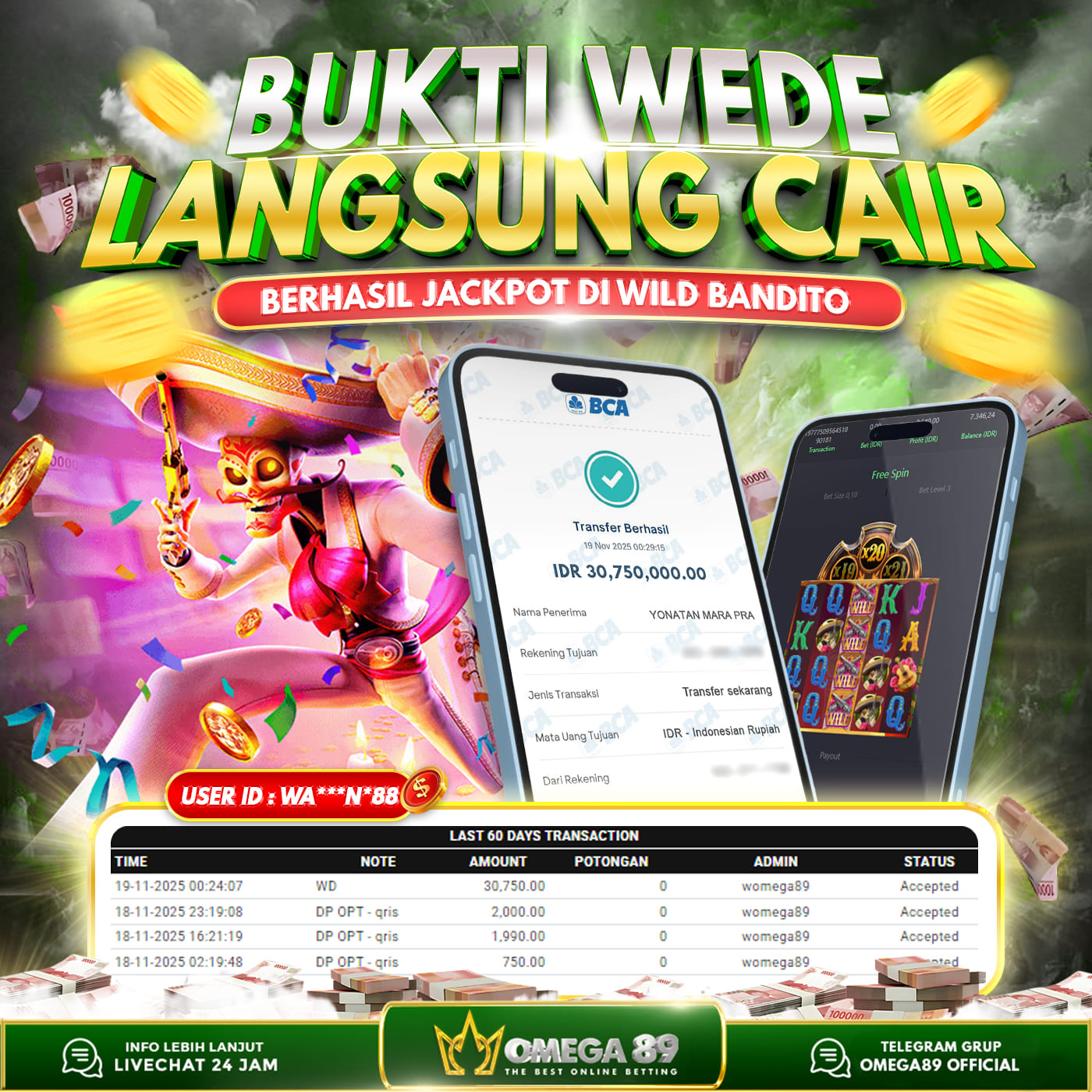Selamat untuk Member OMEGA89 dengan User ID : WA***N*88 Telah berhasil memenangkan jackpot besar dalam permainan slot WILD BANDITO sebesar Rp.30.750.000, Lalu setelah melakukan pengisian formulir untuk melakukan withdraw dengan jeda waktu 3–5 menit pihak Customer Service Omega89 akan melakukan proses transfer ke rekening pribadi milik User ID tersebut dan dana yang sudah di withdraw bisa langsung di cairkan oleh pemenang jackpot. Bukti transfer atau pembayaran yang di berikan pihak Omega89 adalah bentuk bukti pemaabayaran yang VALID/SAH karena langsung dari bank tujuan yang digunakan.