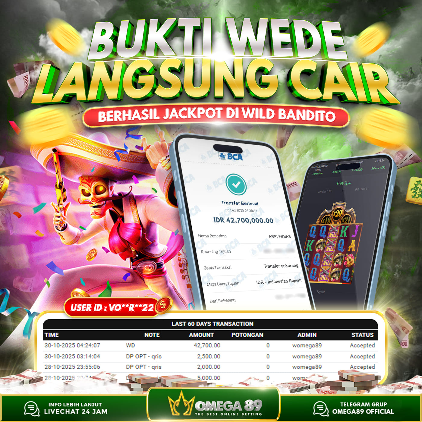Selamat untuk Member OMEGA89 dengan User ID : VO**R**22 Telah berhasil memenangkan jackpot besar dalam permainan slot WILD BANDITO sebesar Rp.42.700.000, Lalu setelah melakukan pengisian formulir untuk melakukan withdraw dengan jeda waktu 3–5 menit pihak Customer Service Omega89 akan melakukan proses transfer ke rekening pribadi milik User ID tersebut dan dana yang sudah di withdraw bisa langsung di cairkan oleh pemenang jackpot. Bukti transfer atau pembayaran yang di berikan pihak Omega89 adalah bentuk bukti pemaabayaran yang VALID/SAH karena langsung dari bank tujuan yang digunakan.