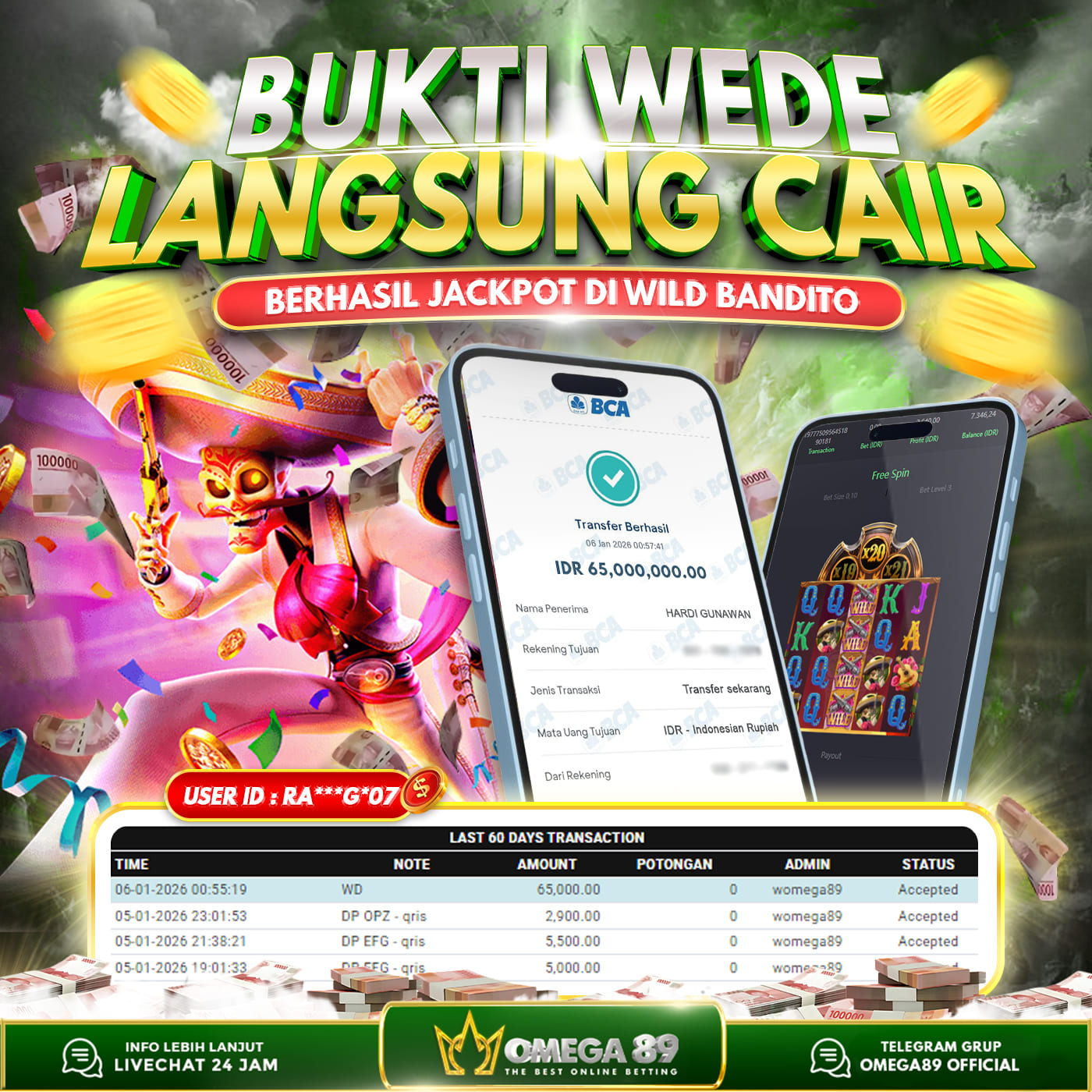 Selamat untuk Member OMEGA89 dengan User ID : RA***G*07 Telah berhasil memenangkan jackpot besar dalam permainan slot WILD BANDITO sebesar Rp.65.000.000, Lalu setelah melakukan pengisian formulir untuk melakukan withdraw dengan jeda waktu 3–5 menit pihak Customer Service Omega89 akan melakukan proses transfer ke rekening pribadi milik User ID tersebut dan dana yang sudah di withdraw bisa langsung di cairkan oleh pemenang jackpot. Bukti transfer atau pembayaran yang di berikan pihak Omega89 adalah bentuk bukti pemaabayaran yang VALID/SAH karena langsung dari bank tujuan yang digunakan.
