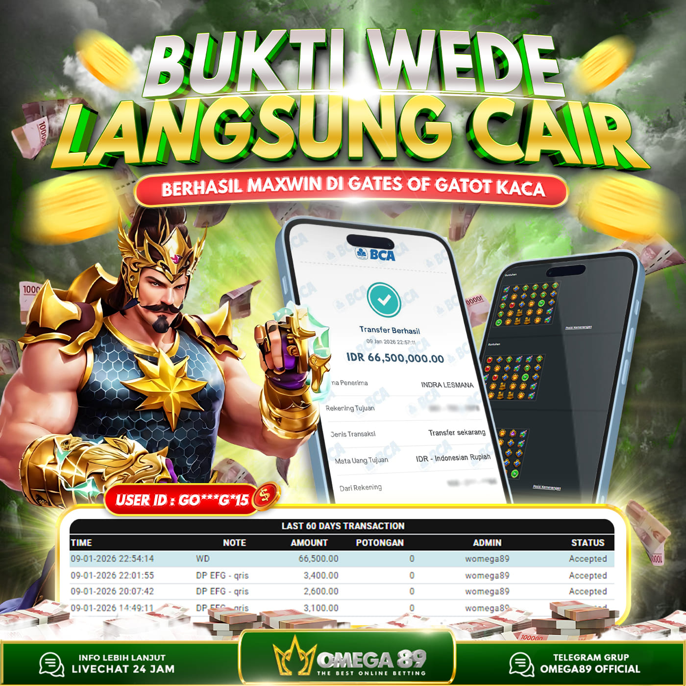 Selamat untuk Member OMEGA89 dengan User ID : GO***G*15 Telah berhasil memenangkan jackpot besar dalam permainan slot GATES OF GATOT KACA sebesar Rp.66.500.000, Lalu setelah melakukan pengisian formulir untuk melakukan withdraw dengan jeda waktu 3–5 menit pihak Customer Service Omega89 akan melakukan proses transfer ke rekening pribadi milik User ID tersebut dan dana yang sudah di withdraw bisa langsung di cairkan oleh pemenang jackpot. Bukti transfer atau pembayaran yang di berikan pihak Omega89 adalah bentuk bukti pemaabayaran yang VALID/SAH karena langsung dari bank tujuan yang digunakan.