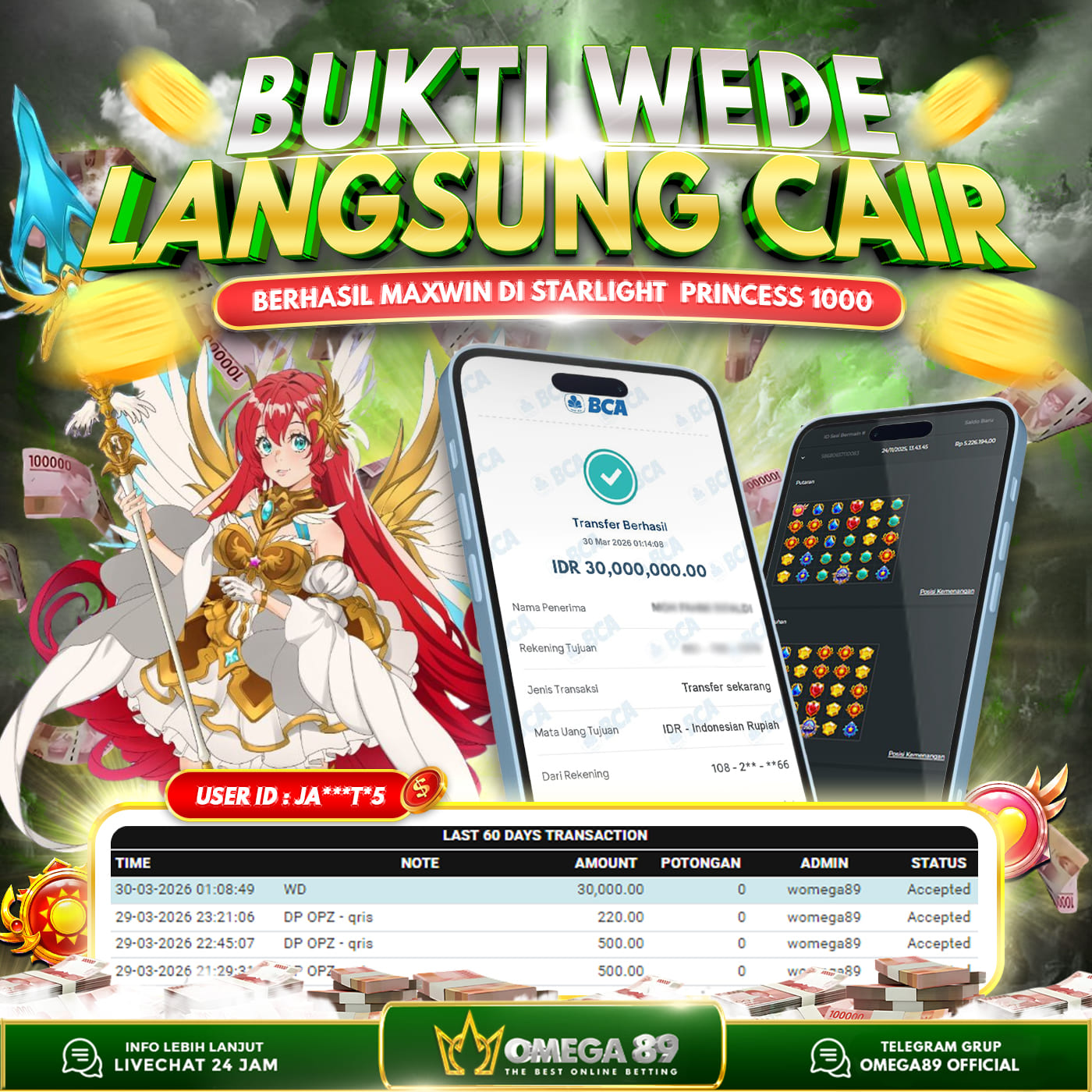 Selamat untuk Member OMEGA89 dengan User ID : JA***T*5 Telah berhasil memenangkan jackpot besar dalam permainan slot STARLIGHT PRINCESS 1000 sebesar Rp.30.000.000, Lalu setelah melakukan pengisian formulir untuk melakukan withdraw dengan jeda waktu 3–5 menit pihak Customer Service Omega89 akan melakukan proses transfer ke rekening pribadi milik User ID tersebut dan dana yang sudah di withdraw bisa langsung di cairkan oleh pemenang jackpot. Bukti transfer atau pembayaran yang di berikan pihak Omega89 adalah bentuk bukti pemaabayaran yang VALID/SAH karena langsung dari bank tujuan yang digunakan.