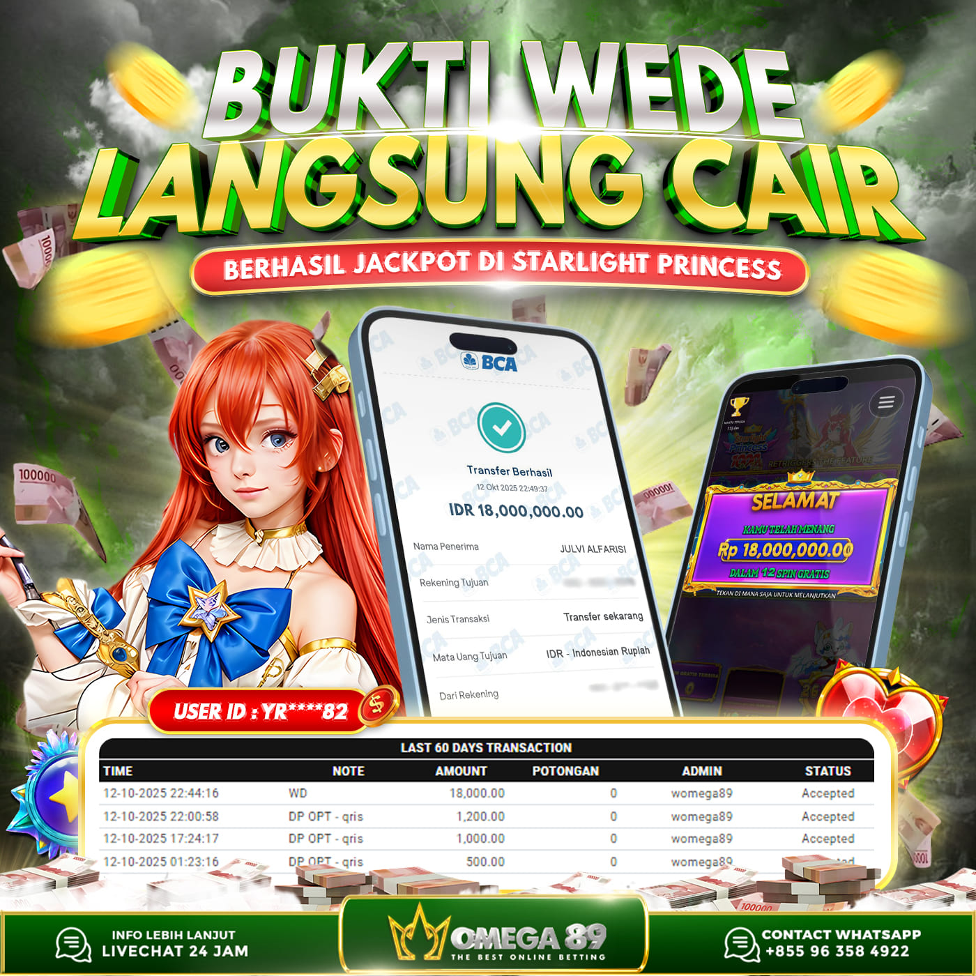 Selamat untuk Member OMEGA89 dengan User ID : YR****82 Telah berhasil memenangkan jackpot besar dalam permainan slot STARLIGHT PRINCESS sebesar Rp.18.000.000, Lalu setelah melakukan pengisian formulir untuk melakukan withdraw dengan jeda waktu 3–5 menit pihak Customer Service Omega89 akan melakukan proses transfer ke rekening pribadi milik User ID tersebut dan dana yang sudah di withdraw bisa langsung di cairkan oleh pemenang jackpot. Bukti transfer atau pembayaran yang di berikan pihak Omega89 adalah bentuk bukti pembayaran yang VALID/SAH karena langsung dari bank tujuan yang digunakan.